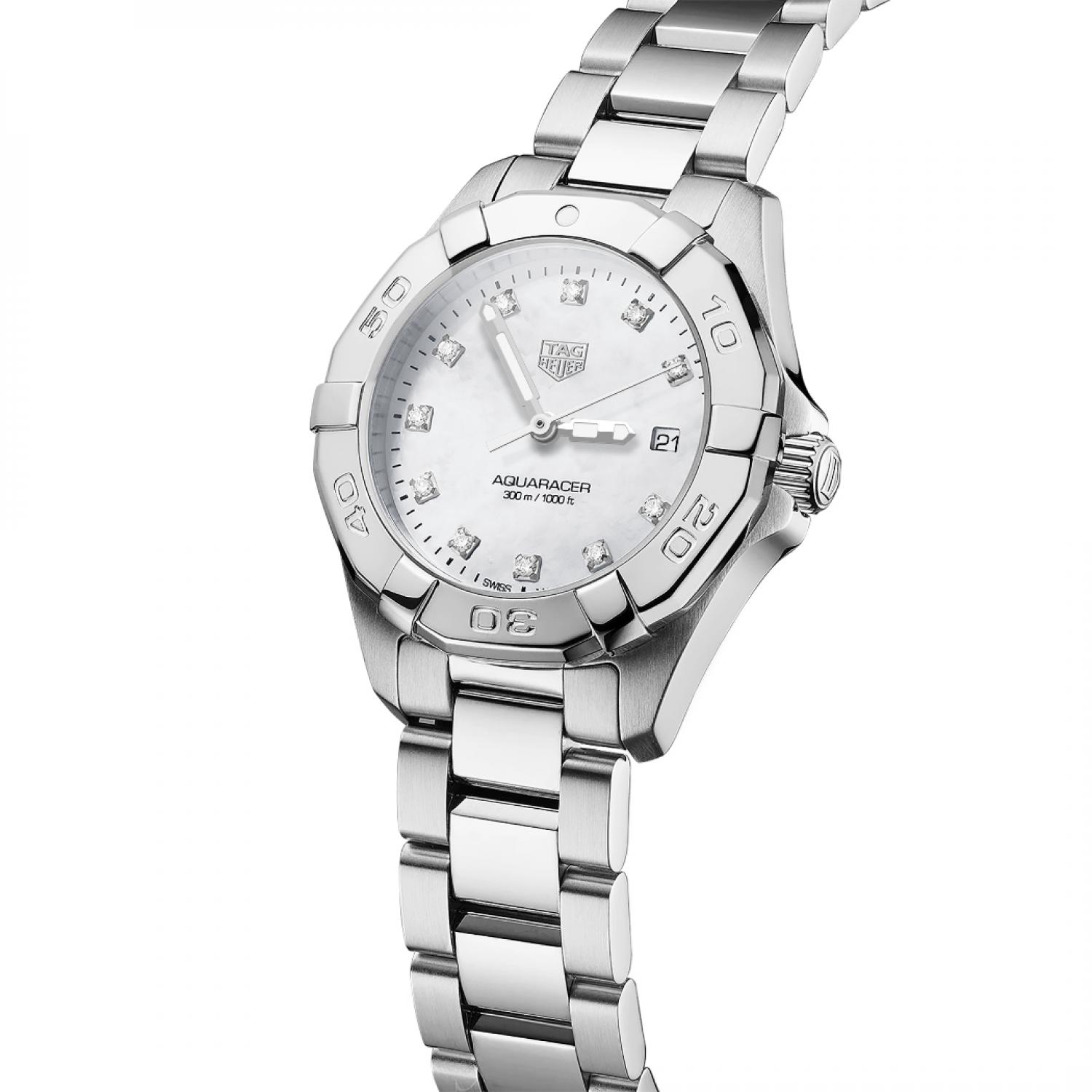 diamond-enriched dial of luminous white mother of pearl. A stylish and