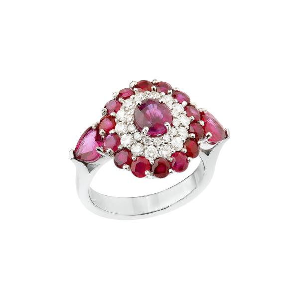 Ring white gold 18 carat with an oval cut rubbie 1,78 carat and brilliant cut diamonds 0,68 carat.