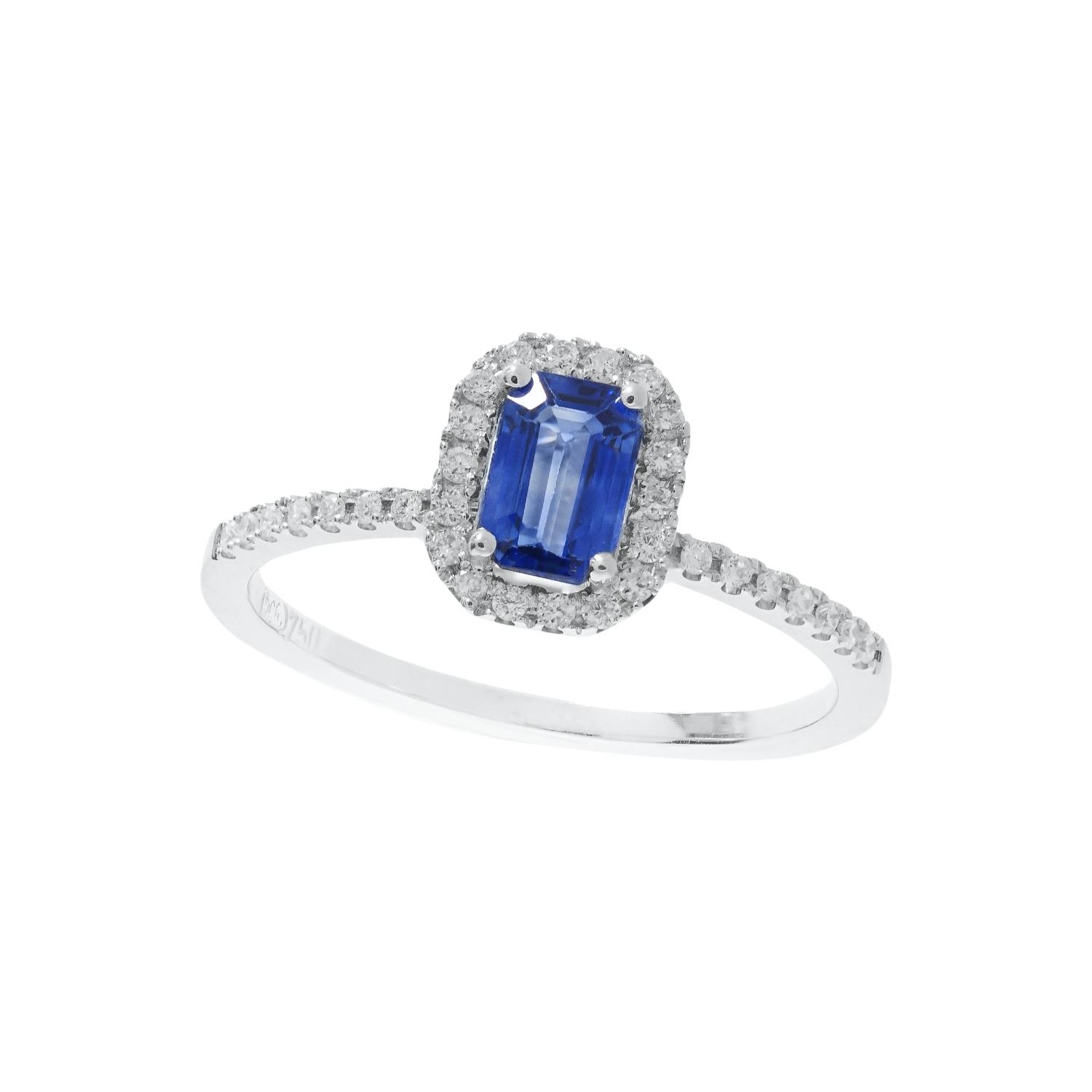 Ring white gold 18 carat with an emerald cut blue sapphire 0,68 carat and brilliant cut diamonds 0,17 carat.