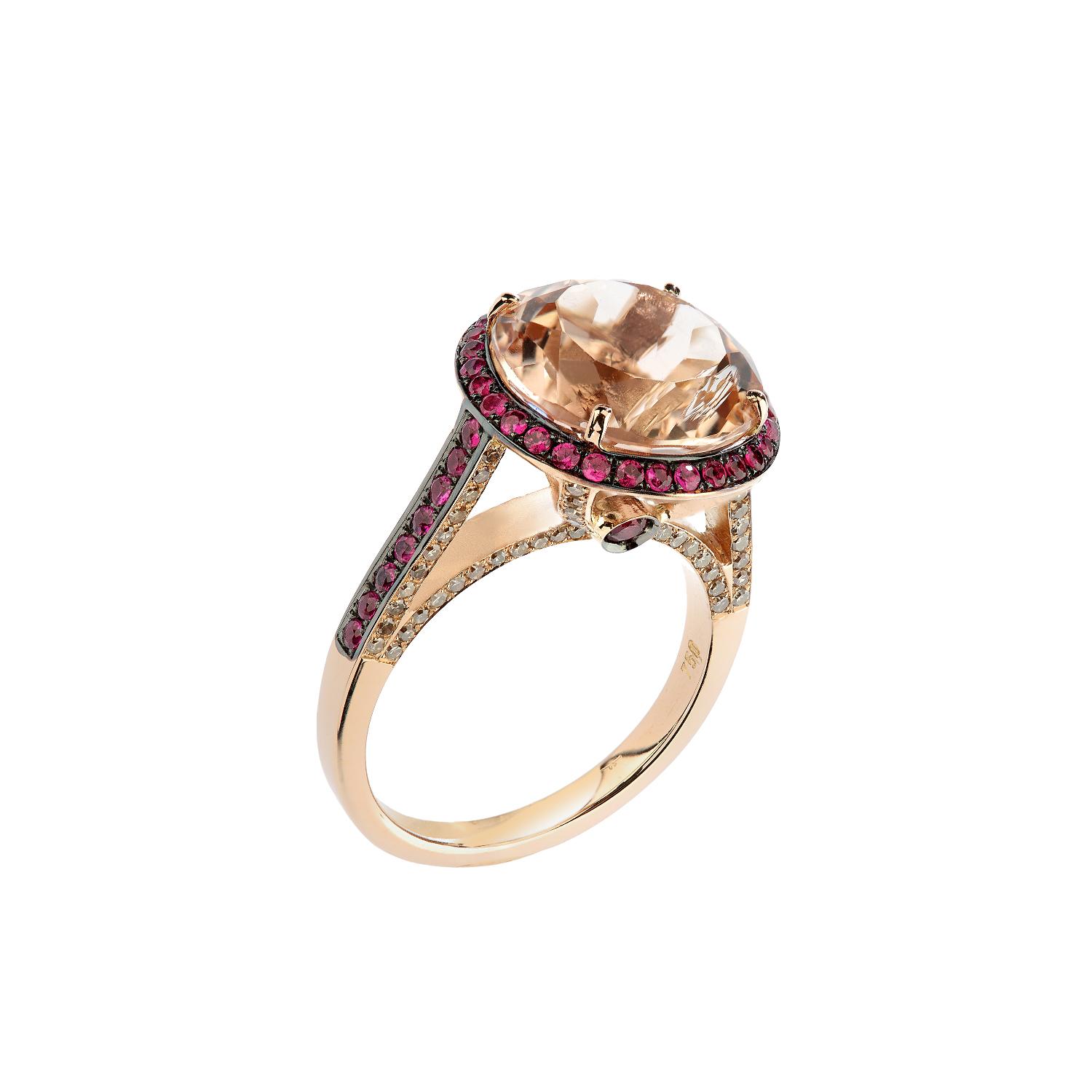Ring rose gold 18 carat with brilliant cut morganite 5,03 carat as a center piece surrounded by brilliant cut diamonds 0,42 carat and rubbies 0,56 carat.