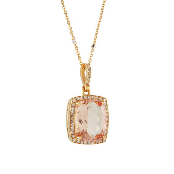 18-carat rose gold ring with brilliant cut diamonds and blue sapphires. The center piece is a square cut morganite.