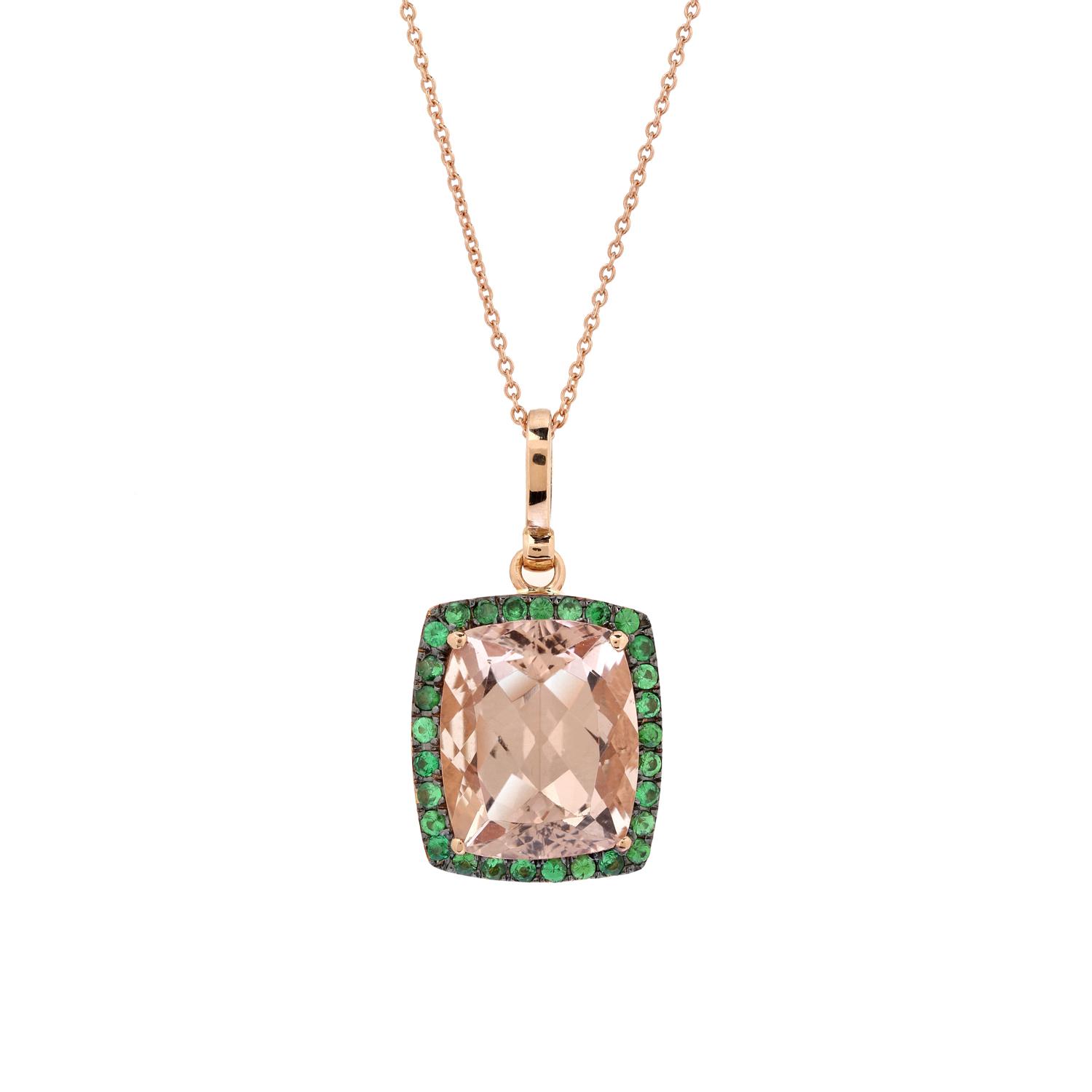 18-carat rose gold pendant with emerald cut, 5,05-carat morganite and full cut 0,47-carat tsavorites.
