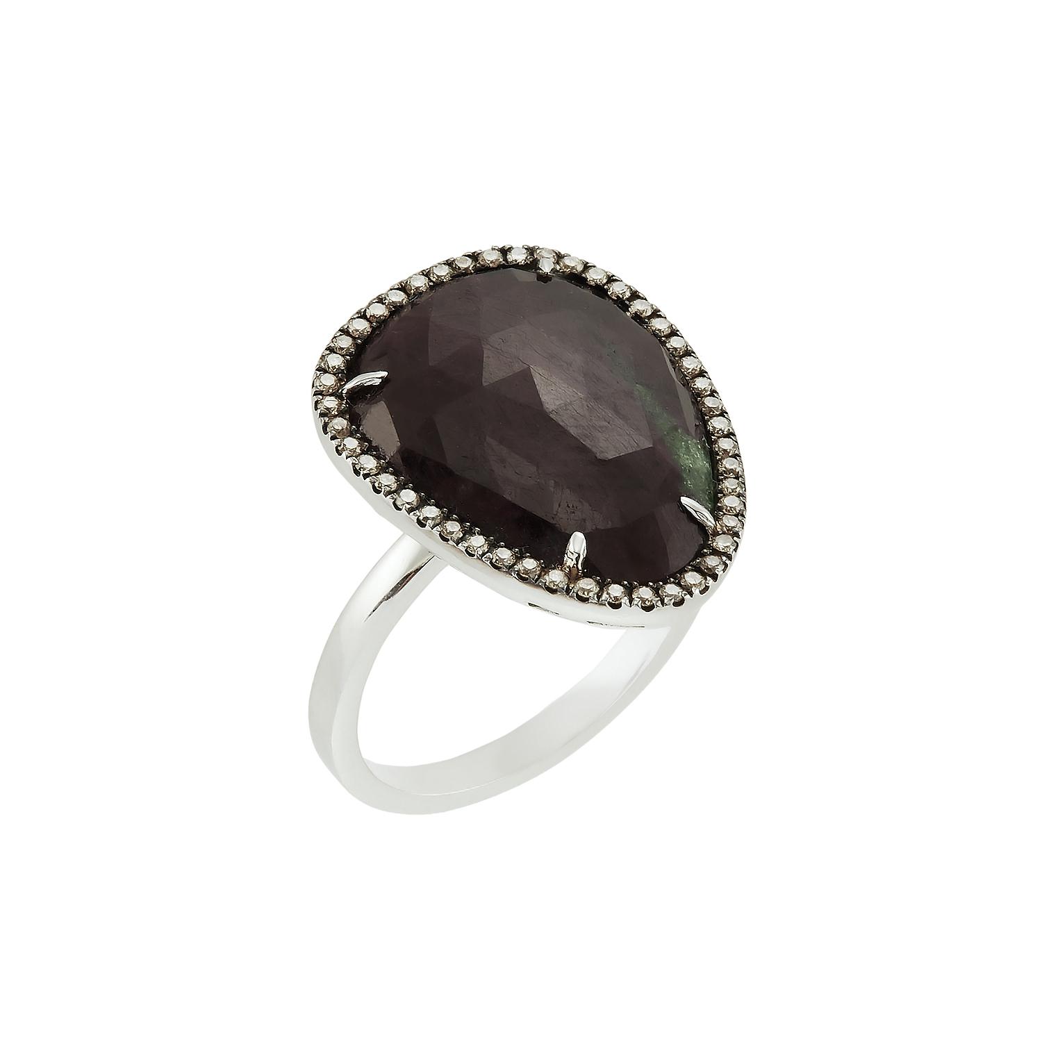 Ring with a captivating sliced black sapphire surrounded by desert sand brown diamonds.