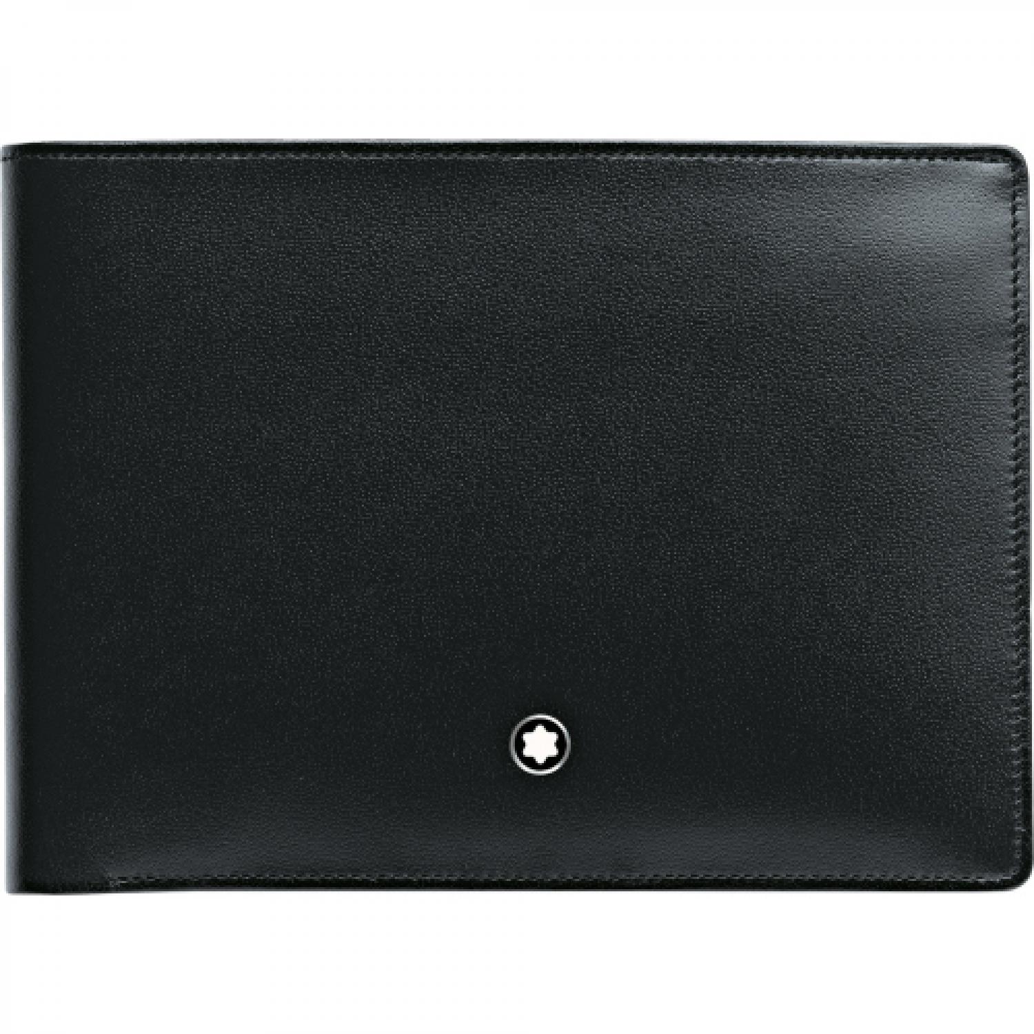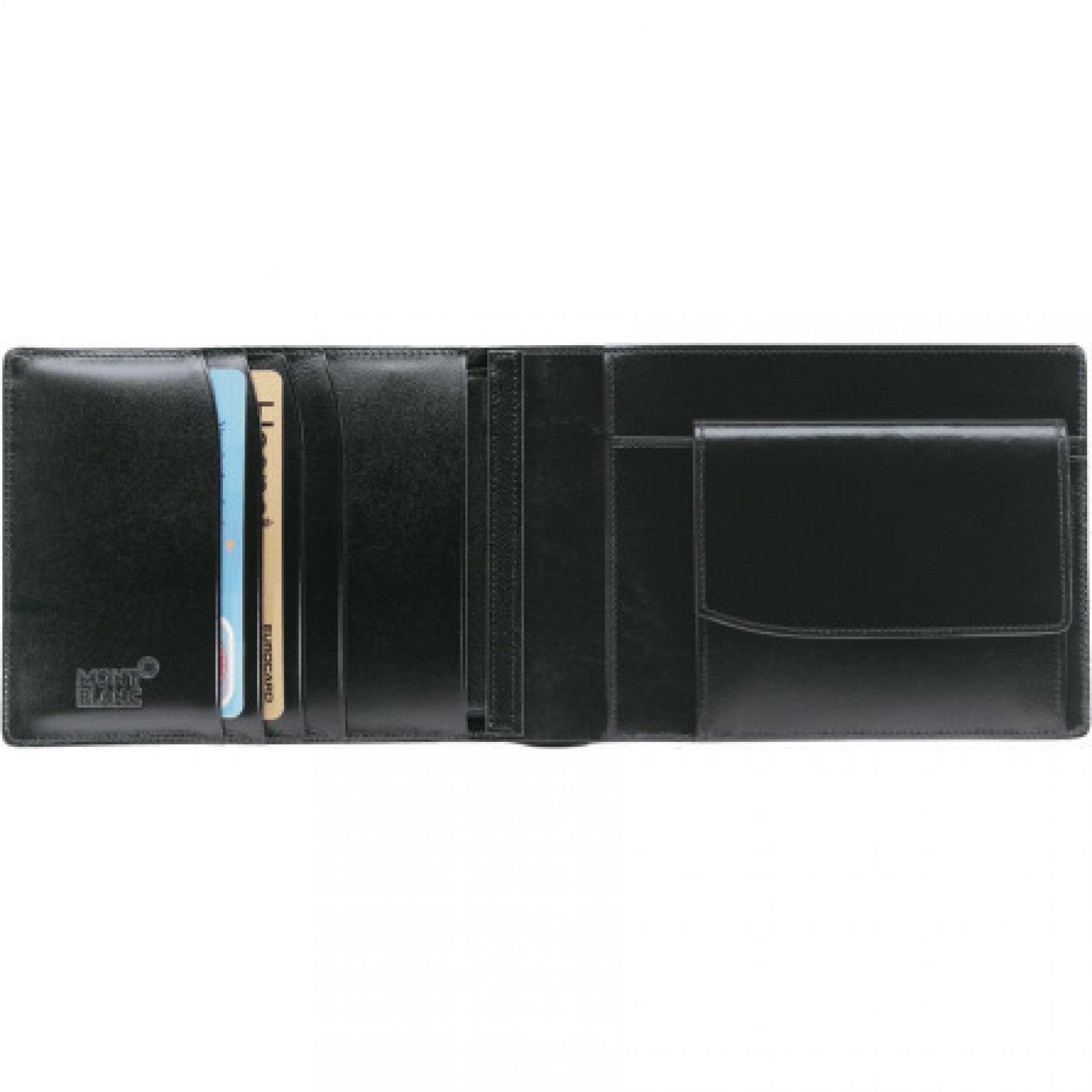 Wallet 4cc, made of black full-grain cowhide with Montblanc deep shine, jacquard lining with Montblanc brand name, Montblanc emblem with palladium-coated ring, with 4 pockets for credit cards, 2 compartments for banknotes, flap coin case