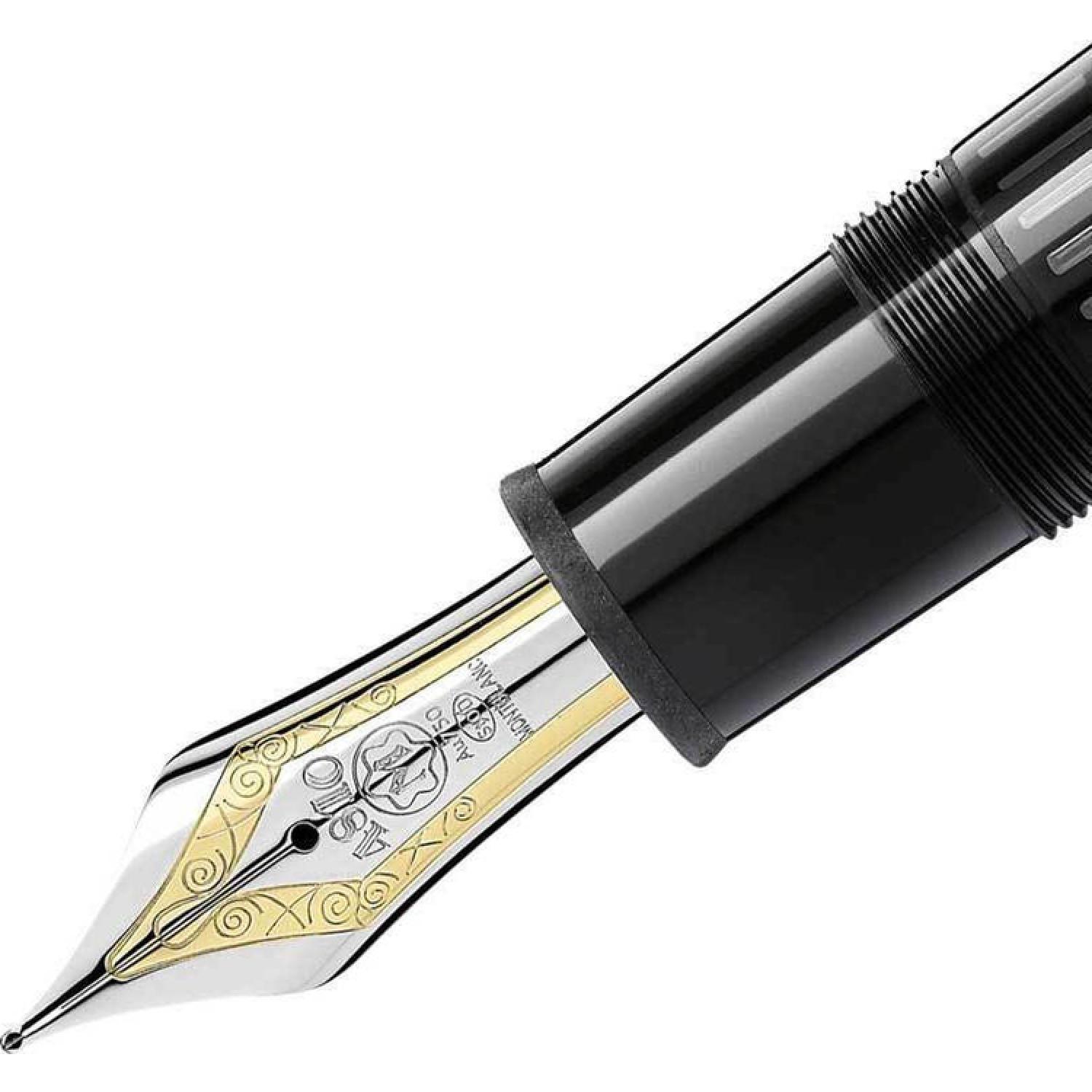 Montblanc Meisterstück Classique Platinum-coated collection is a design that writes history. Introduced in 1924, a word meaning “Masterpiece,” the Meisterstück has become the symbol for high quality luxury writing. The cap and barrel are crafted in black precious resin featuring the iconic white Montblanc emblem inlaid in the cap top. The fountain pen is adorned with a hand-crafted Au750/18K solid gold nib, rhodium-coated
