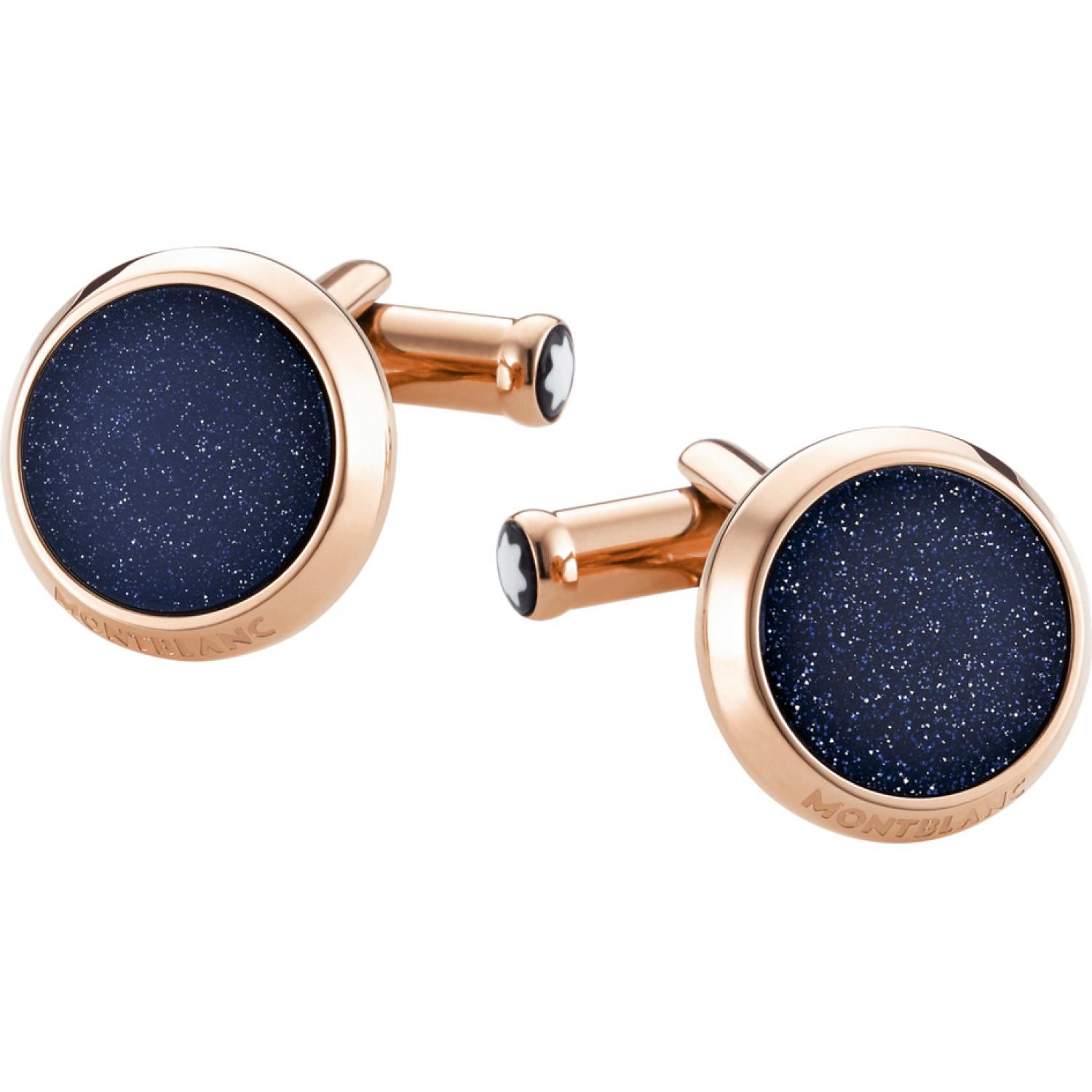 Meisterstuck cufflinks celebrate understated style and elegance. Linked to the Montblanc Meisterstück writing instrument, the timeless round shape in stainless steel with rose gold-coloured PVD finish and a blue goldstone inlay creates a jewel with a powerful Montblanc signature.