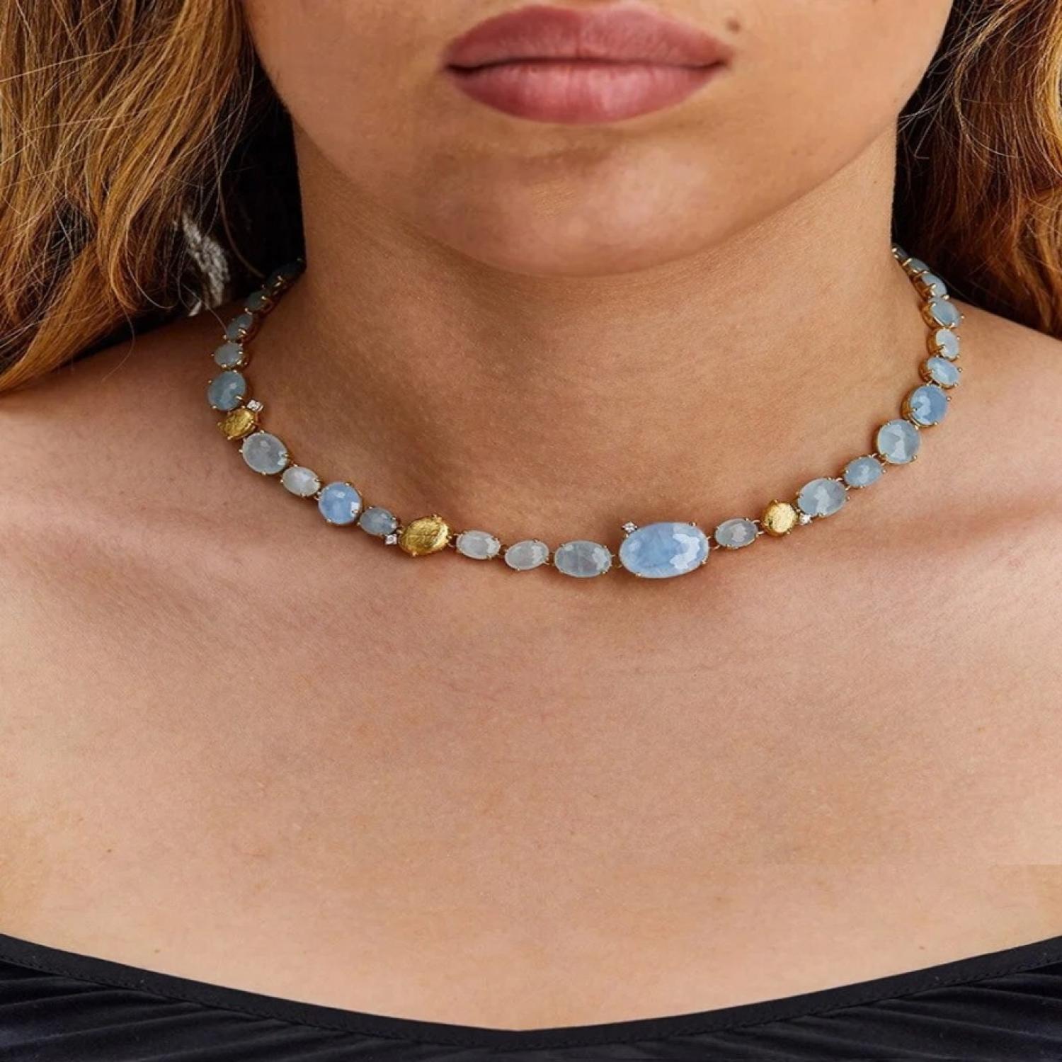 A sparkling waterfall of milky aquamarine and 18kt gold with a delicate touch of diamonds: let yourself be overwhelmed by the freshness and vitality of this necklace, the perfect crowning of a sweet midsummer dream.