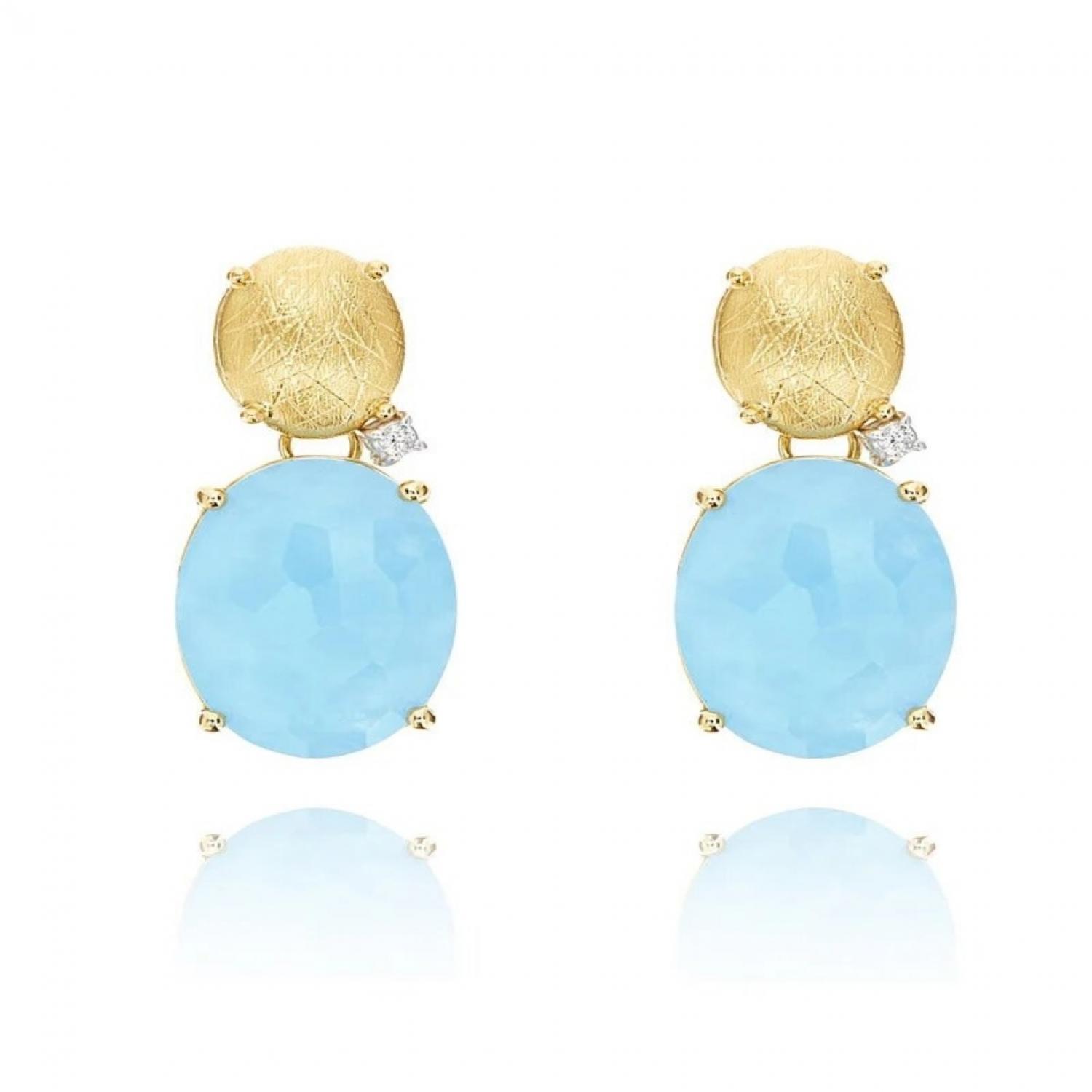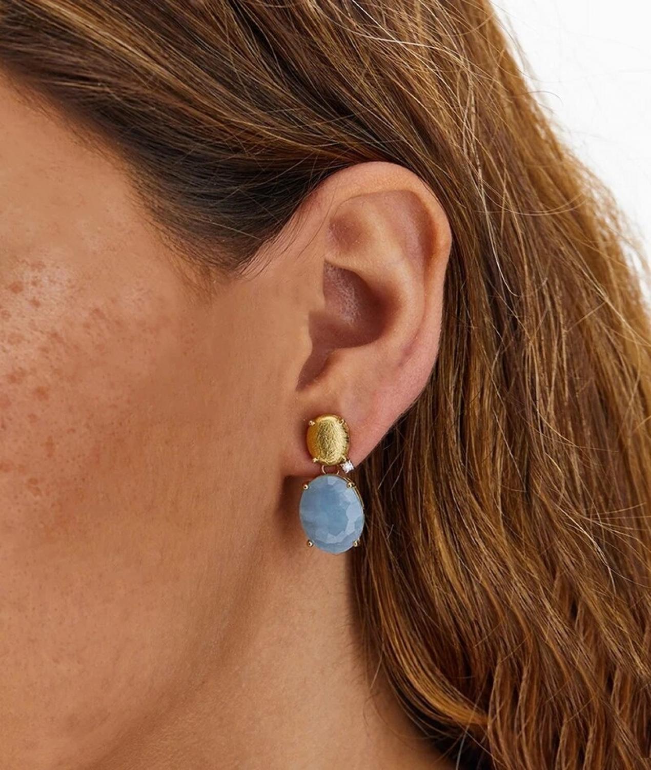 Milky aquamarines and 18 kt gold of IPANEMA earrings give each outfit the freshness and joyous warmth of Summer. A blue piece of sky and sea to always take with you. Laura, who tests each of her creations, has created special butterflies for these earrings, equipped with a little plate to support the upper part of the earring, ensuring a perfect wearability.