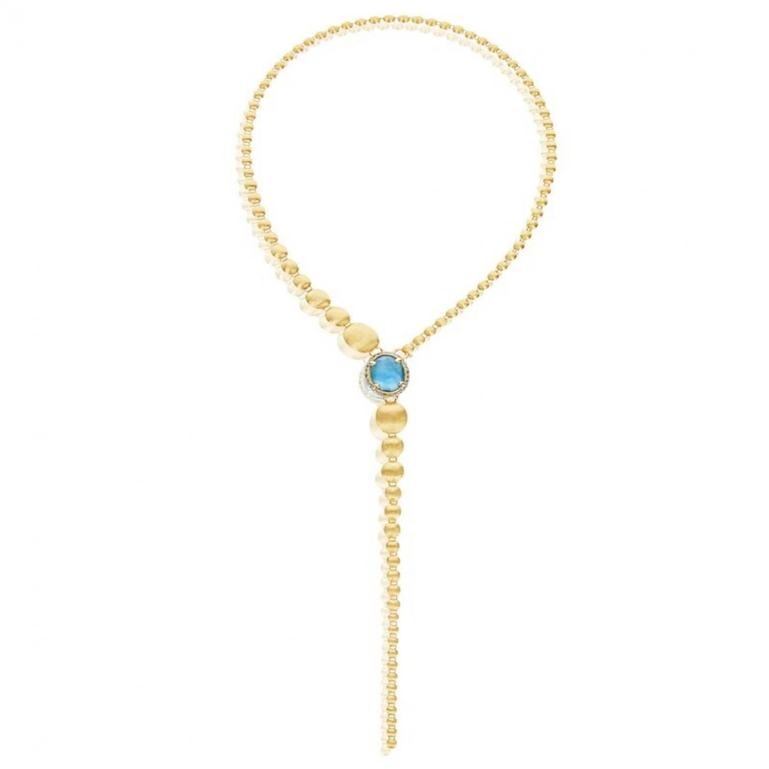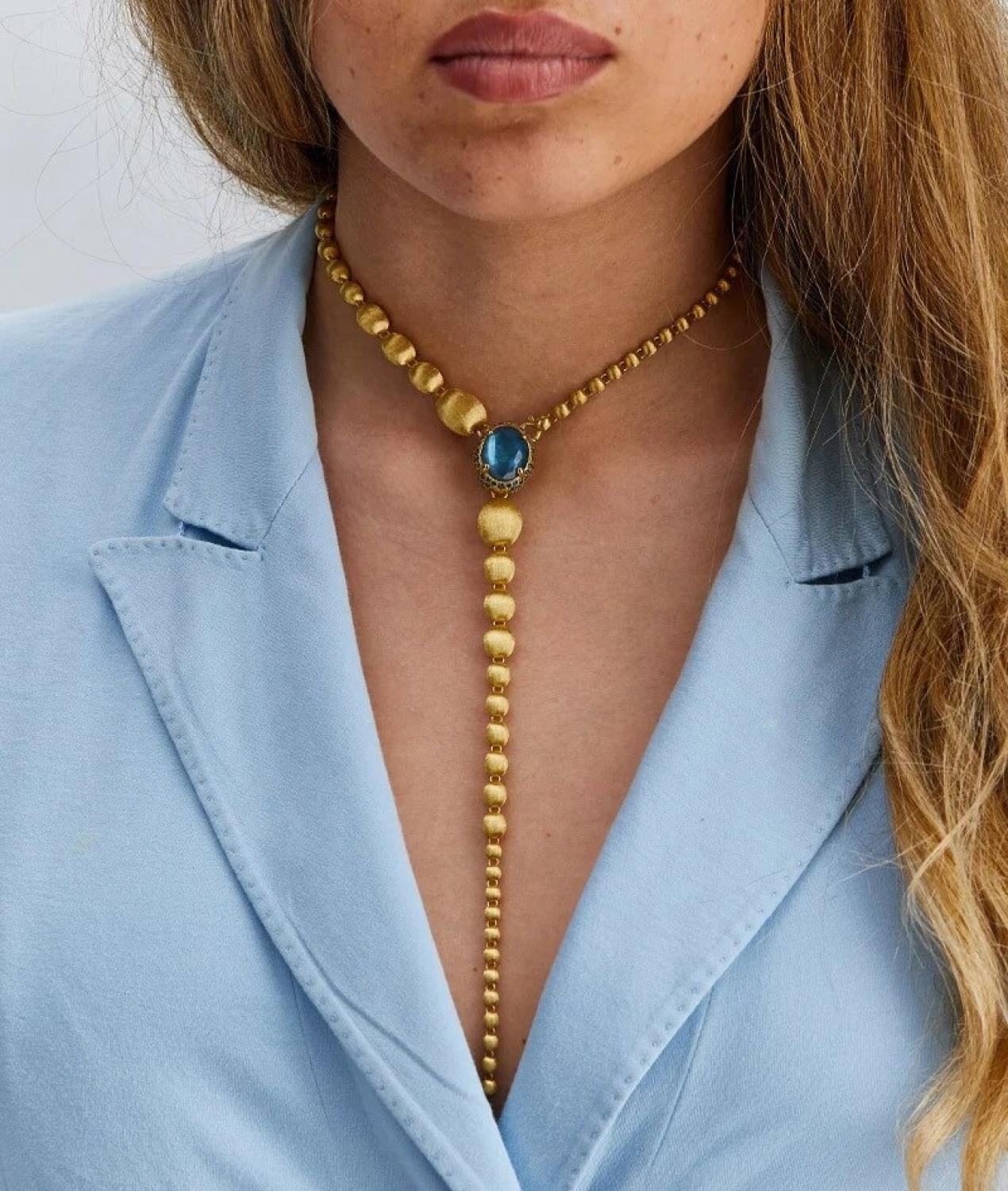 An ode to the elegance of colors and to the versatility, this gold and precious stones necklace is one of Nanis' signature pieces. The double-faced pendant is designed to sublimate the most diverse looks, finely fastened to a row of "unusal pearls", all of them hand-engraved, which can also be detached and combined to the necklace for a longer version.