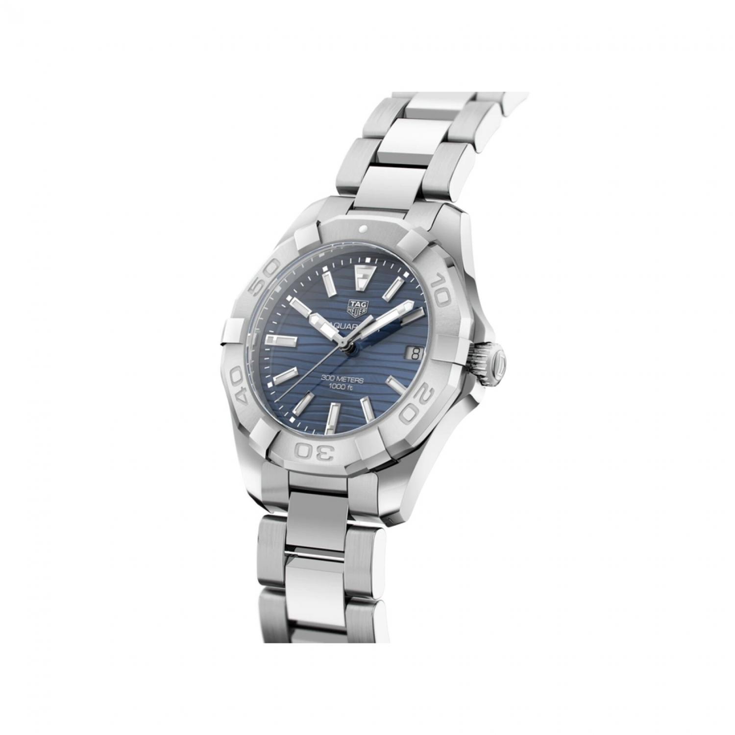 A sophisticated Aquaracer Lady Quartz with stunning blue sunray brushed dial with a wavy pattern, on a 35mm steel case polished and fine-brushed to a gorgeous glow