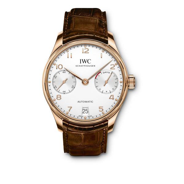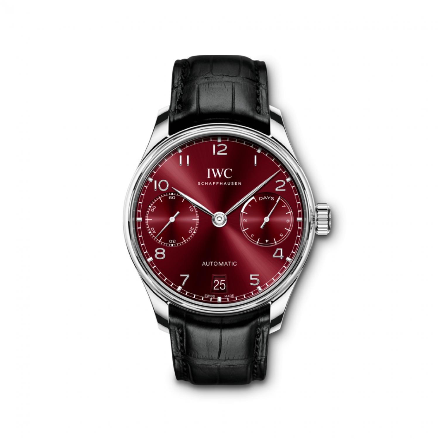 With a characteristic minutes scale, appliquéd Arabic numerals, and slender feuille hands, the Portugieser Automatic expresses the iconic Portugieser design very effectively. The small seconds and the power reserve display are located directly opposite each other at "3 o’clock" and "9 o’clock", which results in a very balanced dial design. This model features a stainless-steel case, a burgundy dial, as well as rhodium-plated hands and appliqués. Ensuring a precise rate is the IWC-manufactured 52010 calibre. The automatic Pellaton winding system features components made of virtually non-wearing ceramic and builds up a power reserve of seven days in two barrels. The decorated movement is visible through a transparent sapphire-glass back. The timepiece is fitted with a black alligator leather strap.