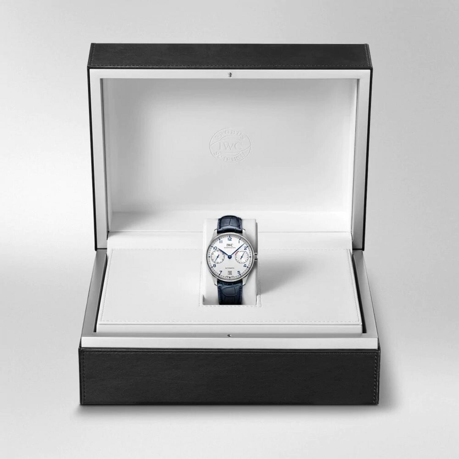 The Portugieser Automatic has become one of the most successful Portugieser models ever to be produced in Schaffhausen. The balanced dial design retains the classic appeal of the legendary original Portugieser first manufactured in the 1930s. The pawls, automatic wheel and rotor bearing in the legendary Pellaton winding system are made from extremely wear-resistant ceramic, while two barrels build up an impressive 7-day power reserve. The ergonomically optimized strap horns ensure greater comfort even on slimmer wrists. The Portugieser Automatic is available with a 42.3-millimetre stainless-steel case, silver-plated dial and blue hands and appliqués. Thanks to the slimmed-down rotor, a glance through the transparent sapphire-glass back reveals even more details of the IWC-manufactured 52010-calibre, such as the black ceramic pawls in the winding system or the Geneva stripe decoration.