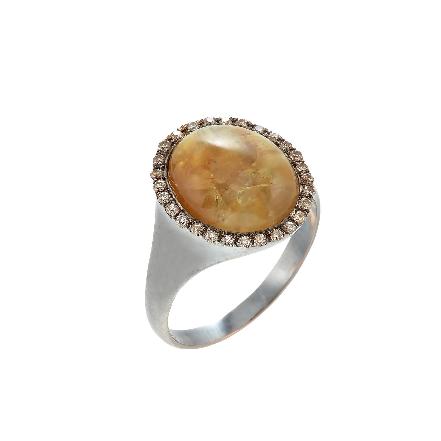 Chevalier ring with honey cabochon sapphire and khaki diamonds on black rodination.