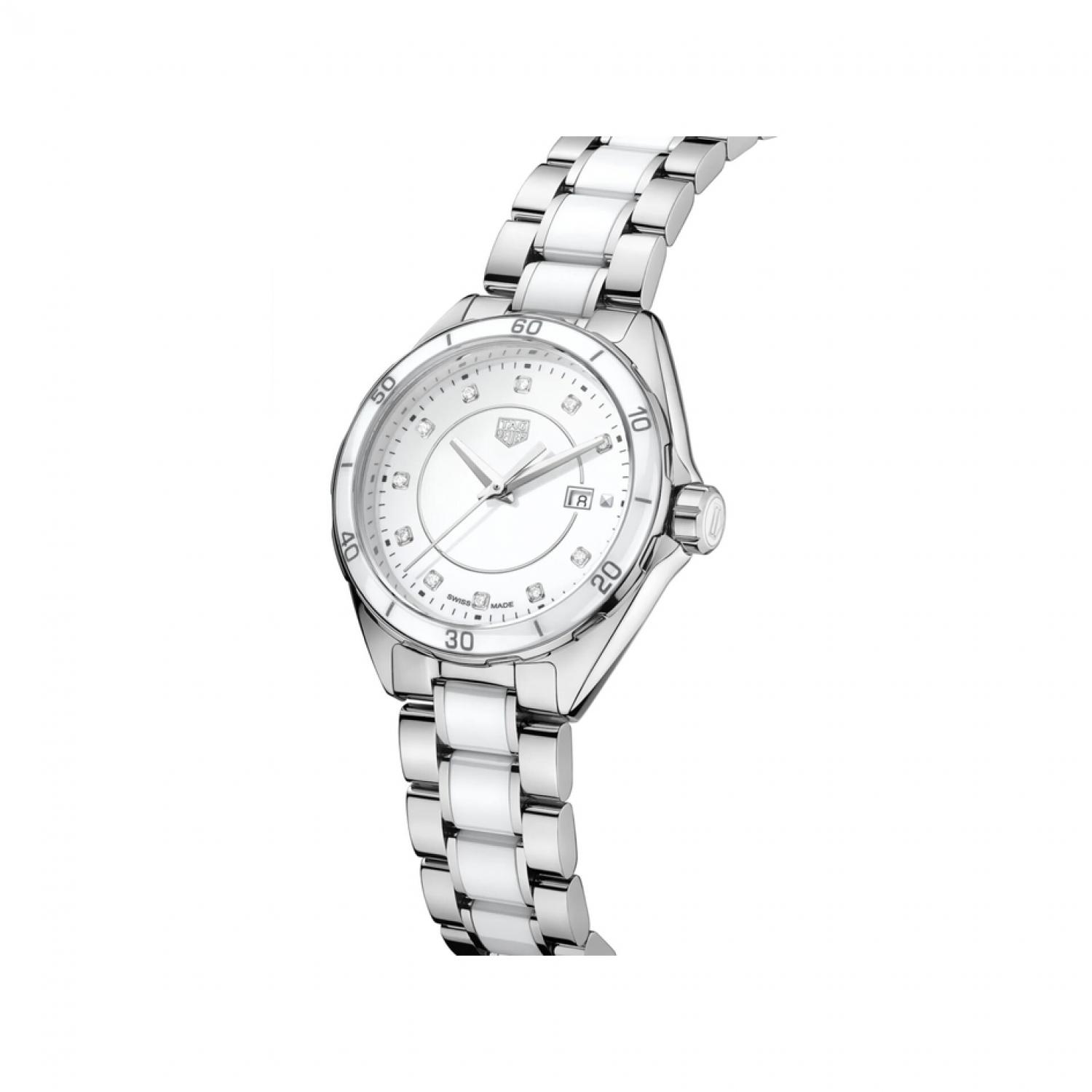 An haute-couture quartz watch for active, sporty women, with slim, 32mm polished steel case and diamond-indexed white dial. Silver-toned details add extra allure to the dazzling dial design.