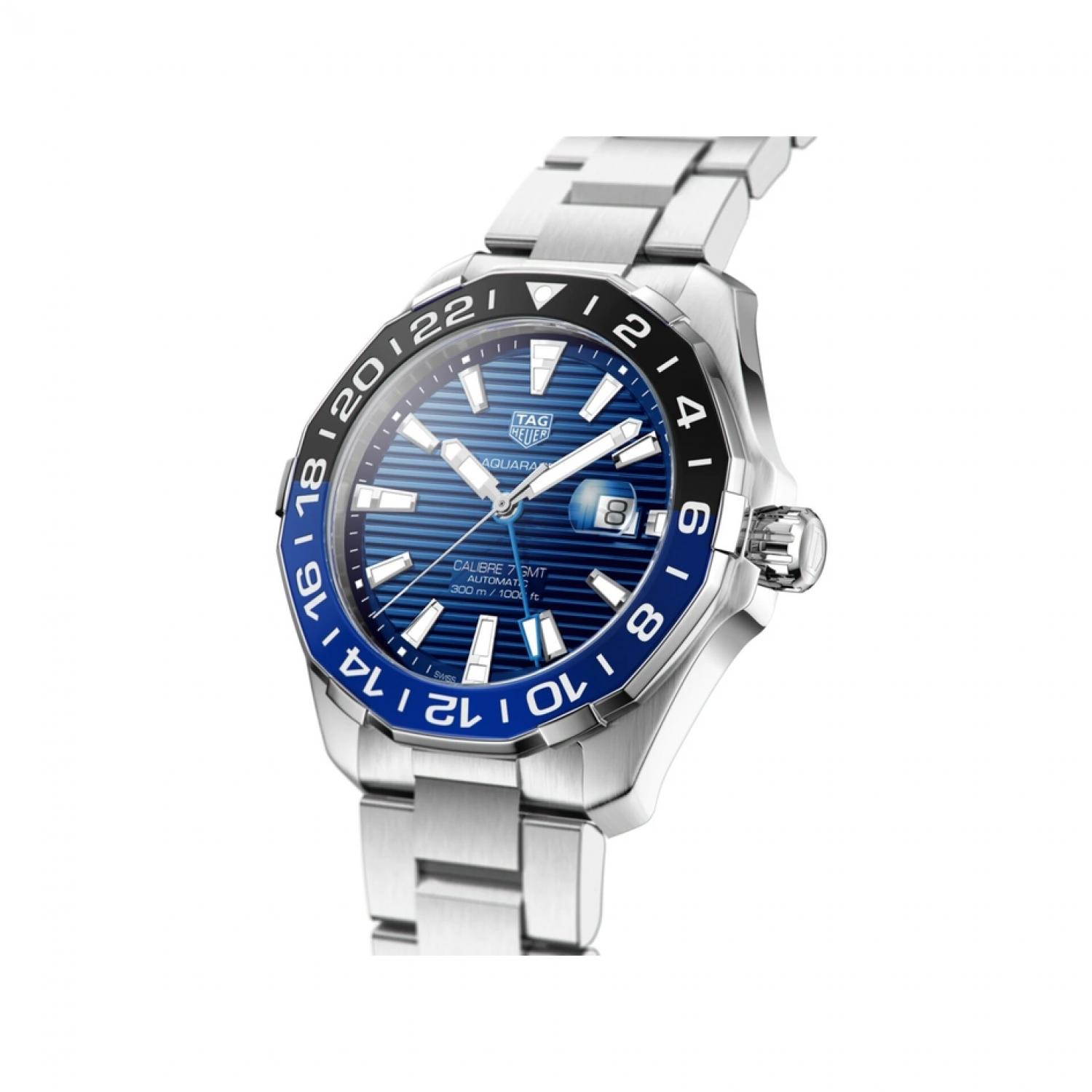 A stainless-steel Aquaracer GMT with stunning blue sunray brushed dial, powered by the Calibre 7. Life-proof, up for every challenge, this is the perfect everyday watch, functional and elegant, reliable in all conditions.