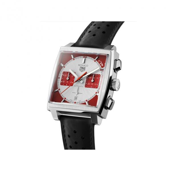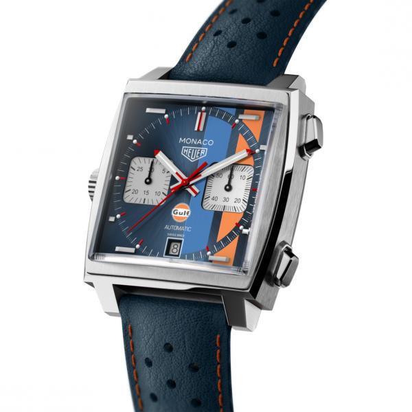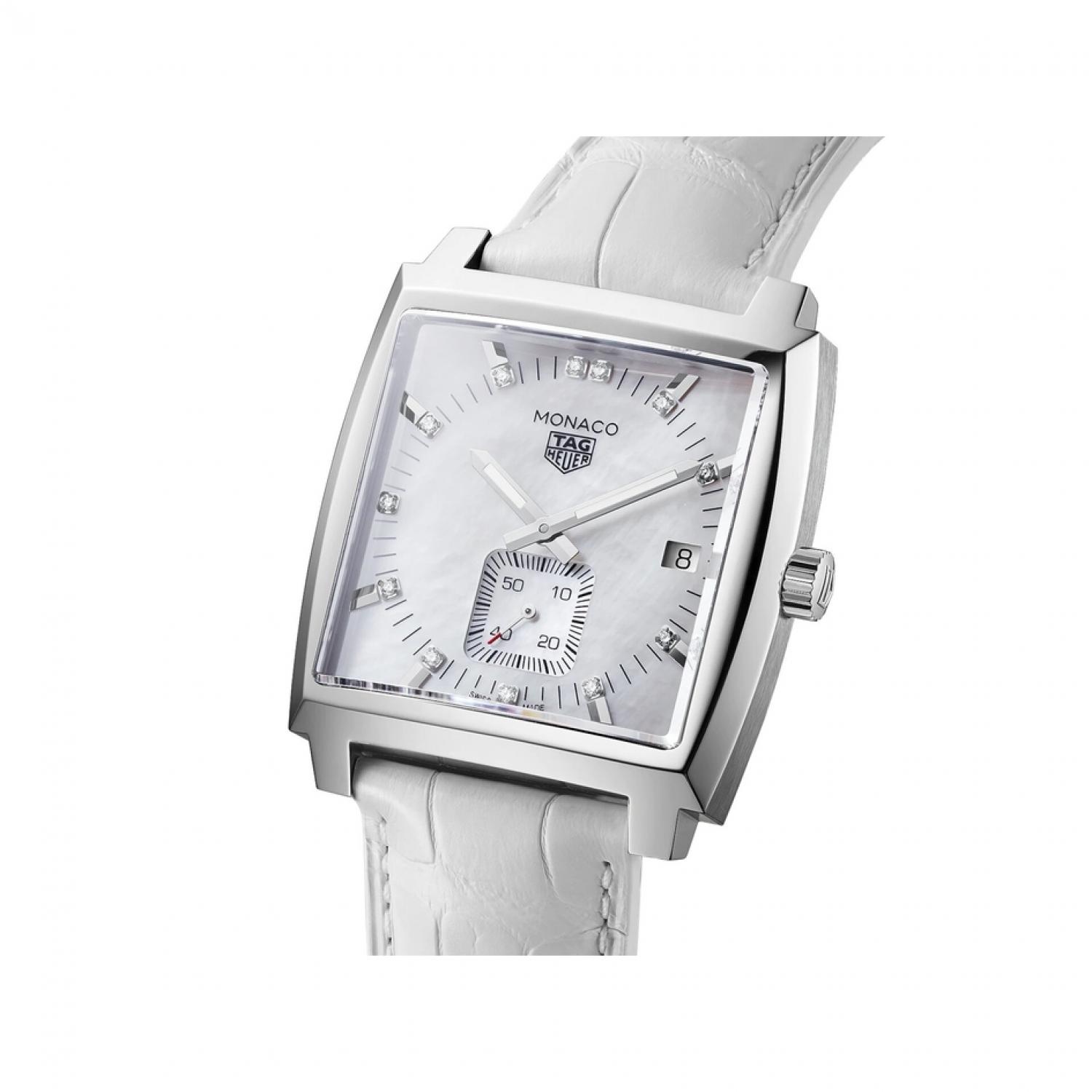 A serious piece of head-turning eye candy: 12 white diamonds on a white mother-of-pearl dial and an on-trend, very feminine strap in white alligator. The distinctive 37mm square-shaped case is in polished steel, as is the crown at 3 o'clock. The most glamorous Monaco yet.