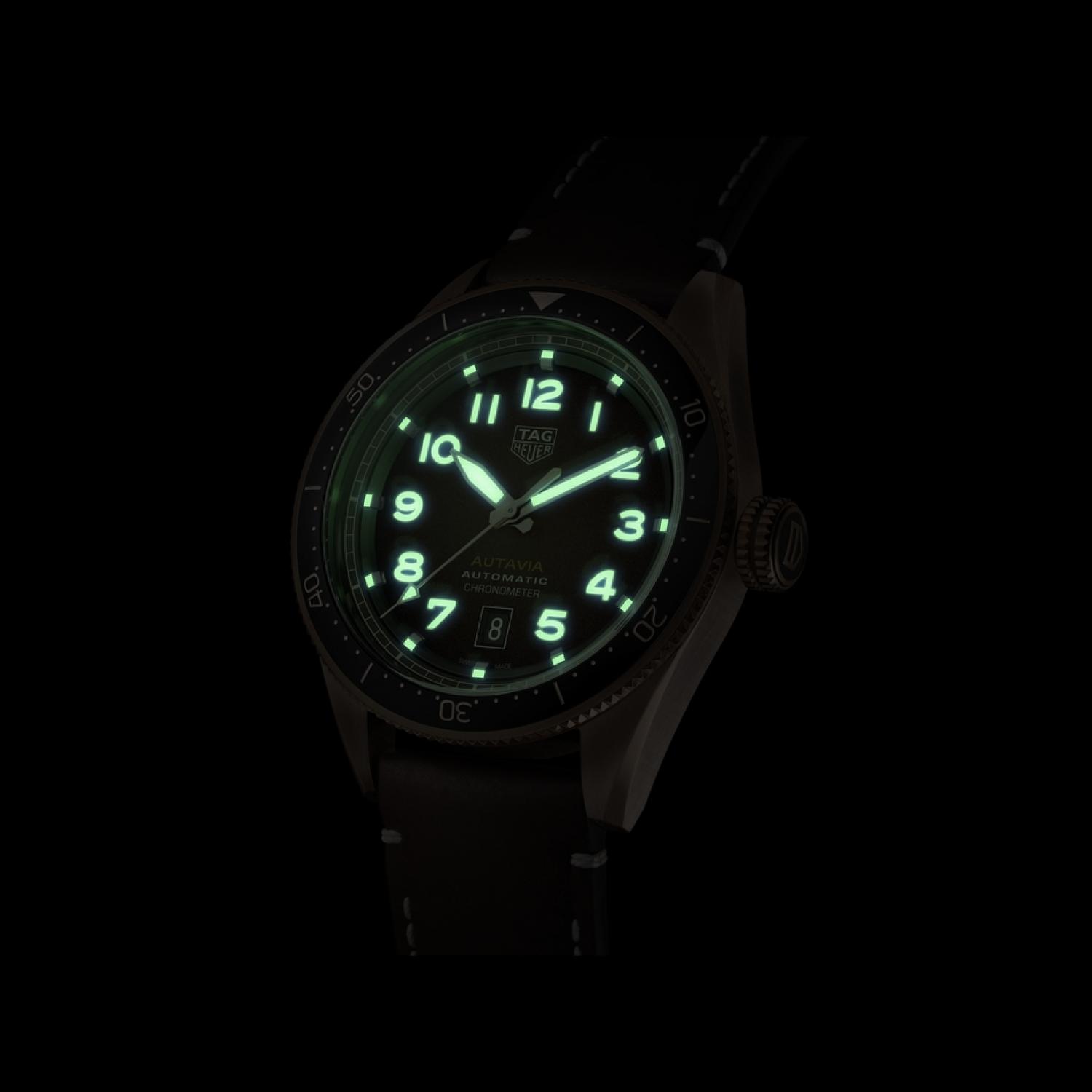 The sparse dial design is highlighted by numerals and sword-shaped hands with ivory Super-LumiNova® treatment for enhanced readability in low light. The easy-to-read date window is at 6 o’clock.