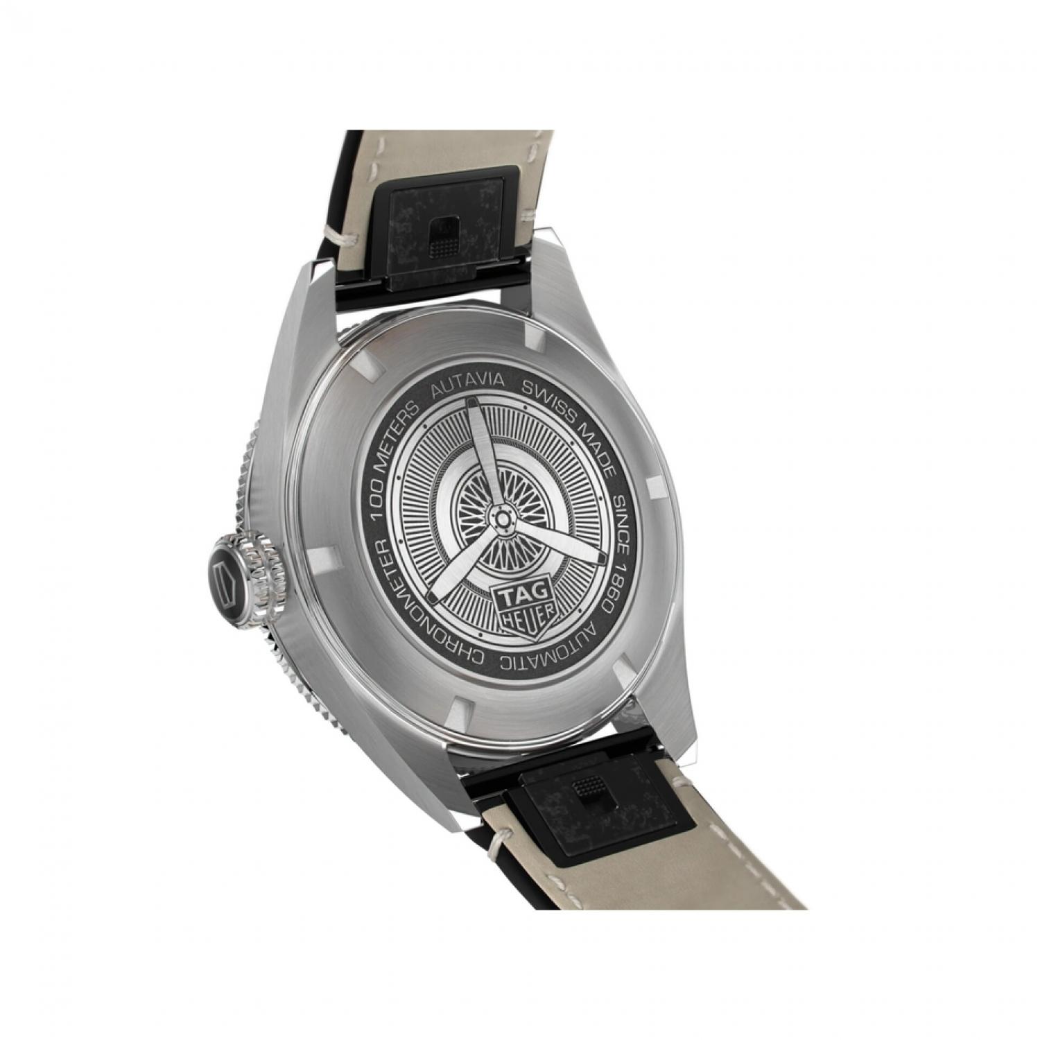 The dial’s “orange peel” gives alluring depth and grace to the design. The silver-toned numerals and hands are Super-LumiNova® treated for extra punch. On the back, an iconic engraving of airplane propeller inside a steering wheel evokes the Autavia’s aviation and automobile roots.