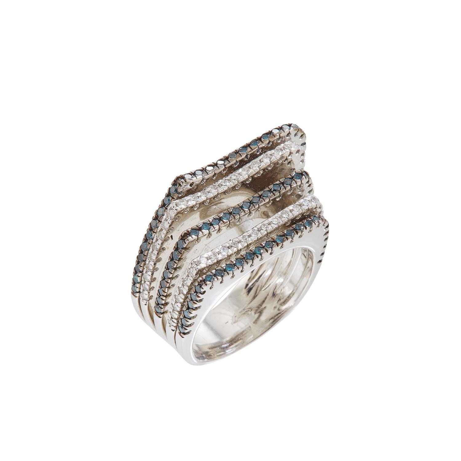 A Ring carved into ocean Waves with white and azure diamonds on black rodination.