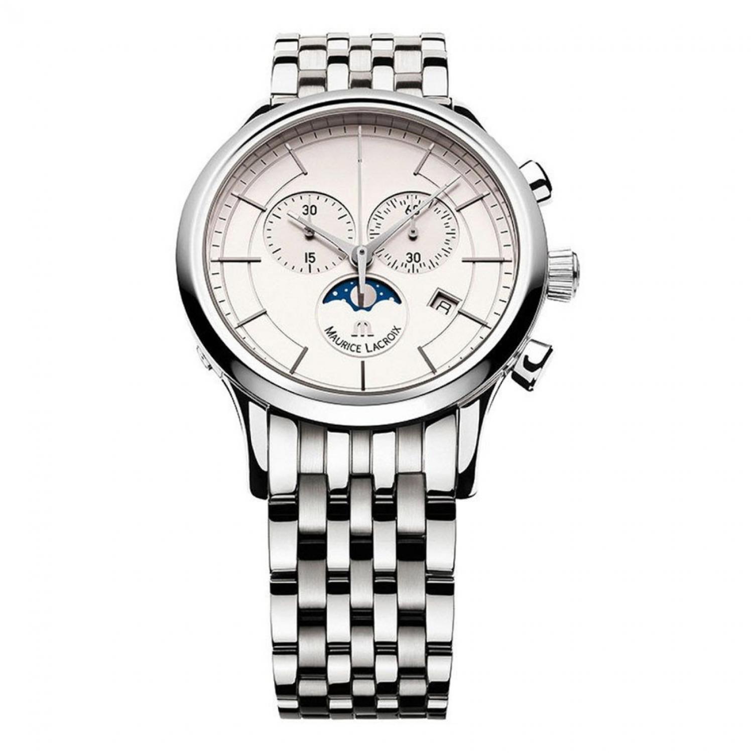 Introducing the Maurice Lacroix Les Classiques Chronographe Phases De Lune luxury watch with the ISA 8171 quartz movement . The watch has a case size of 40 mm and is made of the highest quality materials. The case is made of high-quality steel and the upper part is covered with highly resistant sapphire crystal with an anti-reflective layer. The whole design is complemented by a quality steel bracelet. The watch is manufactured by the renowned brand Maurice Lacroix