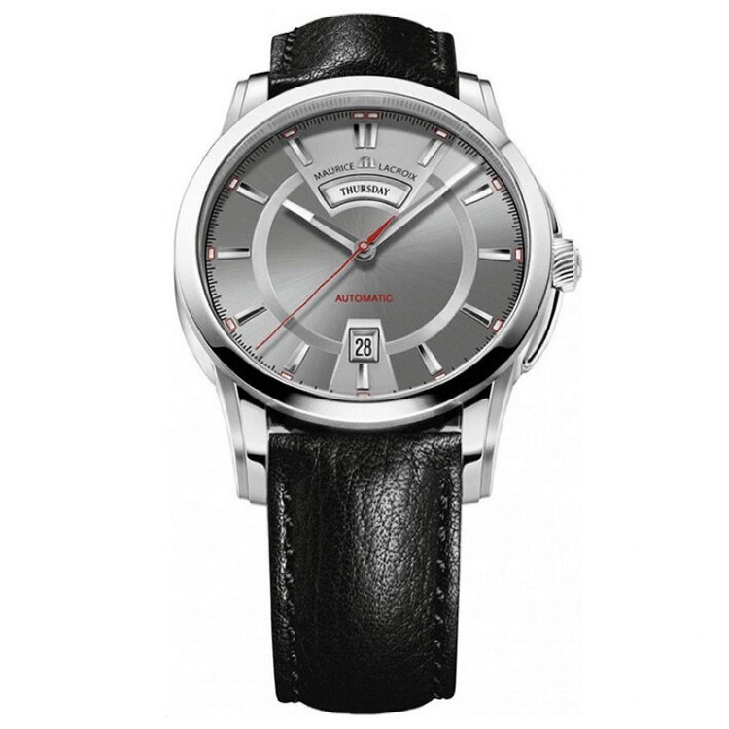 Maurice Lacroix Watch Pontos Day Date. Brushed and polished surfaces blend harmoniously on the stainless steel case. Each facet interfaces with light differently, enhancing owner enjoyment and reminding the wearer of the quality case construction. Measuring 40mm in diameter, the proportions are perfectly judged providing widespread appeal. Short case lugs, sharply taper downwards encouraging the strap to cosset the wrist in comfortable union. The Maurice Lacroix Watches Pontos Day/Date is available in three Vintage dial options, green, light grey or light brown. Their retro appearance confers a classicism which is very appealing. Each variant employs the same contrasting colour for the central seconds hand and the text, Automatic is proclaimed in the lower portion of the dial. The diamond cut Hours and Minutes hands have luminous tips aiding legibility in poor light. Areas of brightness and shade are created by the applied diamond cut indexes, once more successfully exploiting light. A minute track frames the extremities of the dial. A date aperture resides above 6 o clock and most notably a day display is presented in an arching aperture below noon. The expression of time is concise yet comprehensive. The alluring aesthetics are completed with the discreet crown which neatly hugs the caseband and is protected by the adjacent crown guards.