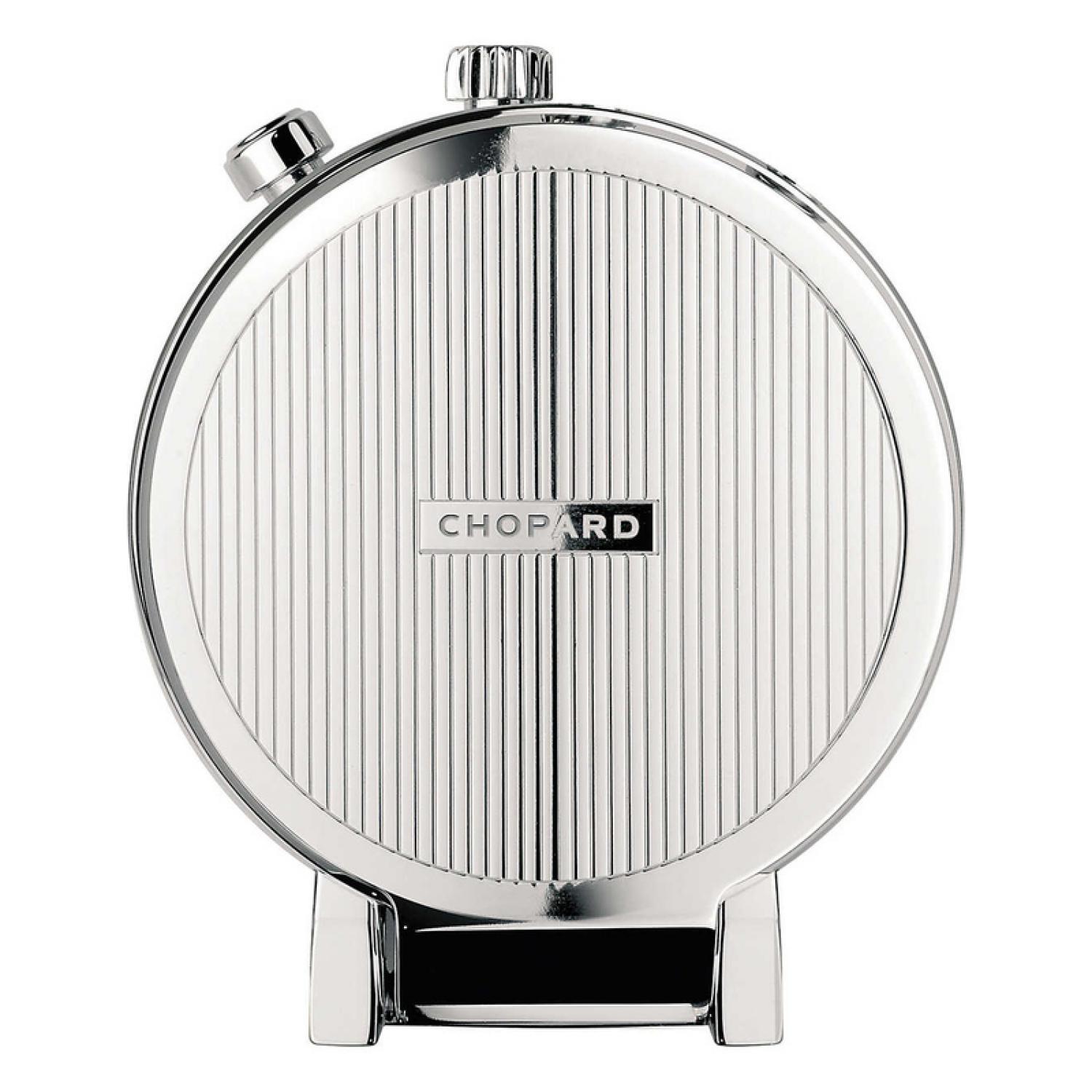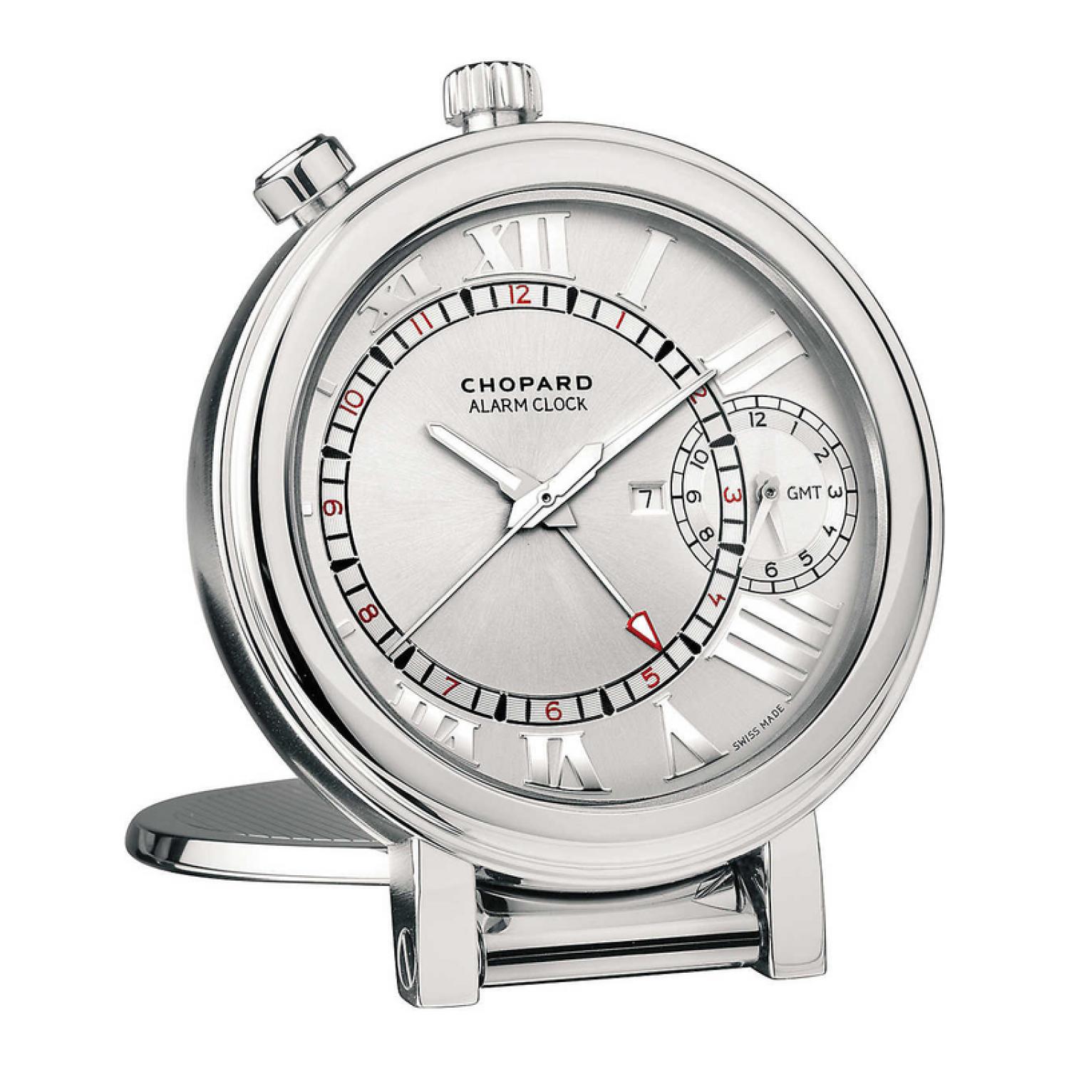 This retro alarm clock in stainless steel, whose elegant design recalls the classic pocket watches of the L.U.C collection, is the ultimate companion for today's traveling man. Boasting a quartz movement and a GMT time zone counter at 3 o'clock, this compact, stylish accessory is resolutely masculine and perfectly Chopard.