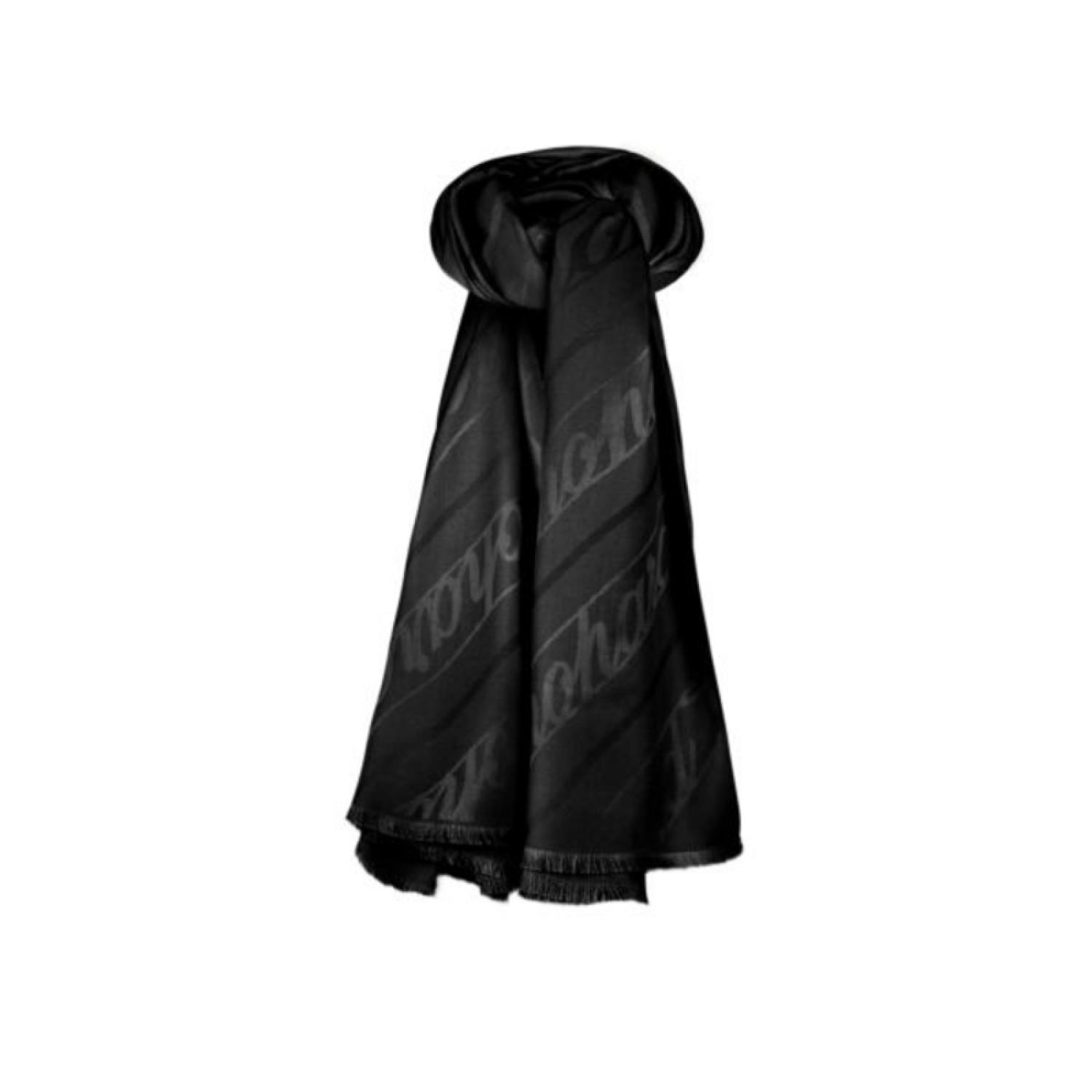 Chopardissimo, the tender velvetiness of a black silk and cashmere stole,embellished with the graceful calligraphy of the Chopard logo. The fine, swirling letters shine through thanks to subtle highlighting. This discreet, stylish piece is ideal for enhancing the simplest outfit or the dressiest ensemble, and will be a key feature of your wardrobe.