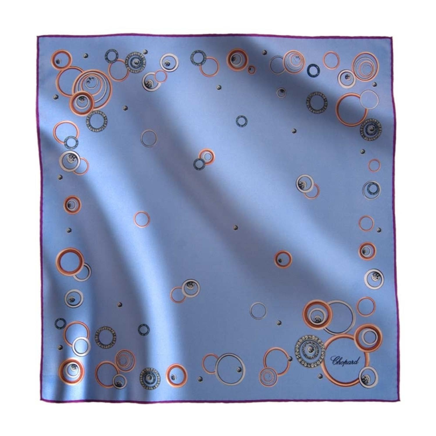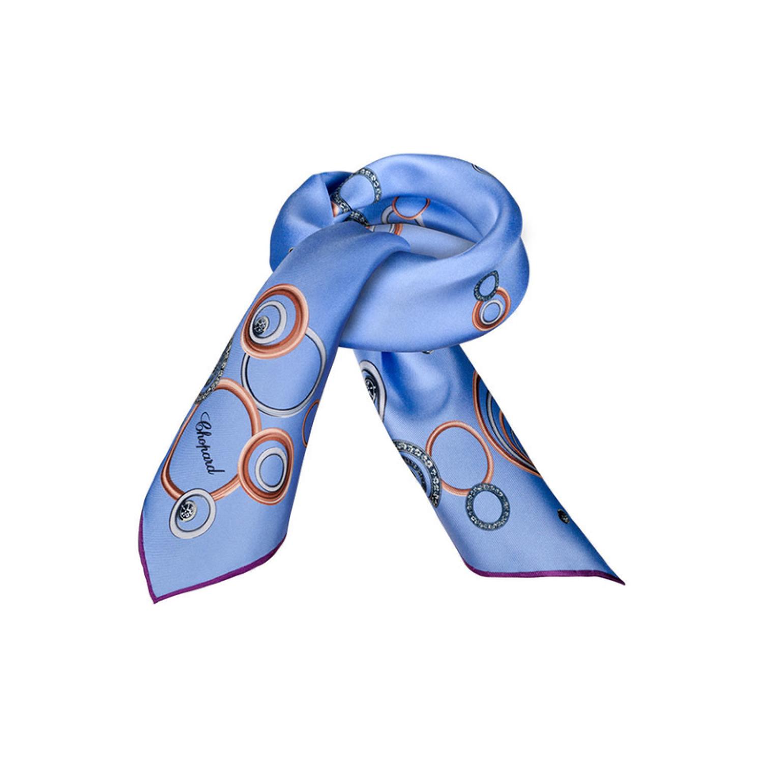 Ode to the Happy Spirit jewelry collection, this light blue silk twill scarf features gold and diamond rings off all different sizes, with hypnotyzing charm. This small, elegant and radiant square is perefct for keeping your neck warm, brightening up an outfit and illuminating the complexion. You can let your imagination go and wear it however you want, around your neck, on your wrist, in your hair, or even tie it to a strap on your bag.