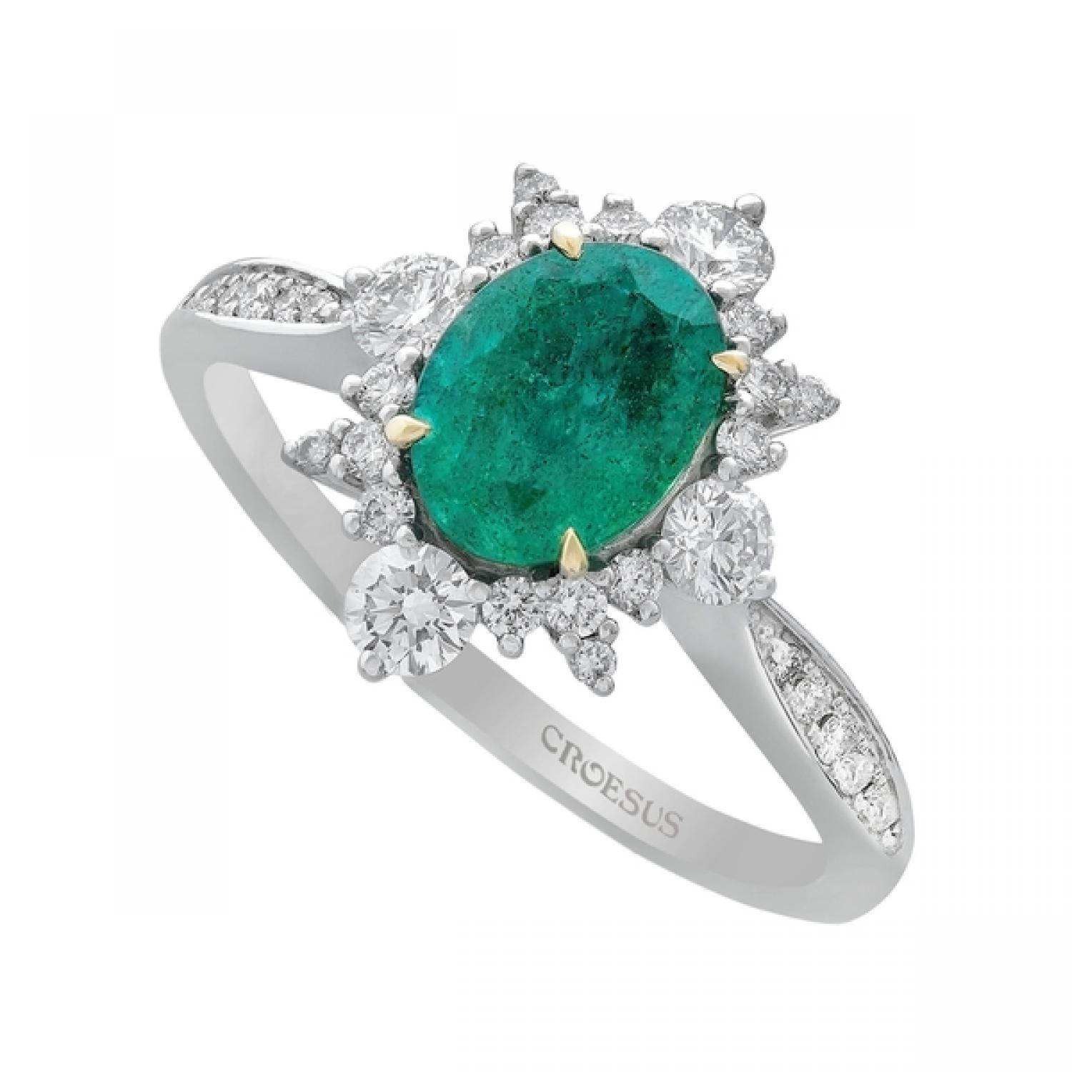 Ring white gold 18K with an oval cut emerald 1,1 carat and brilliant cut diamonds total weight 0,52 carat GVS1.