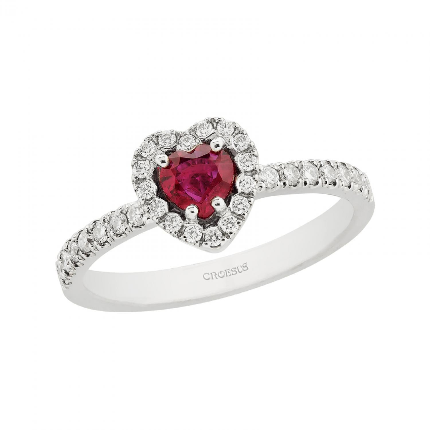 Ring K18 white gold with a heart shape ruby 0,71ct and brilliant cut diamonds total weight 0,23ct