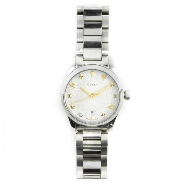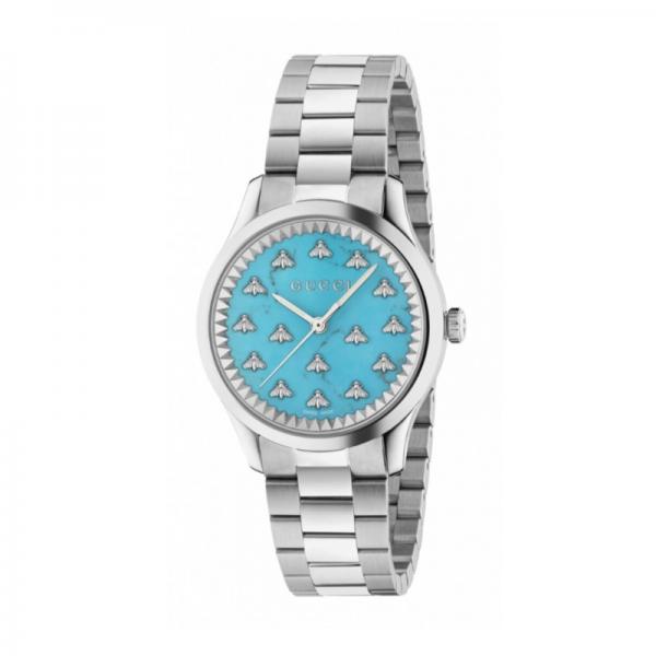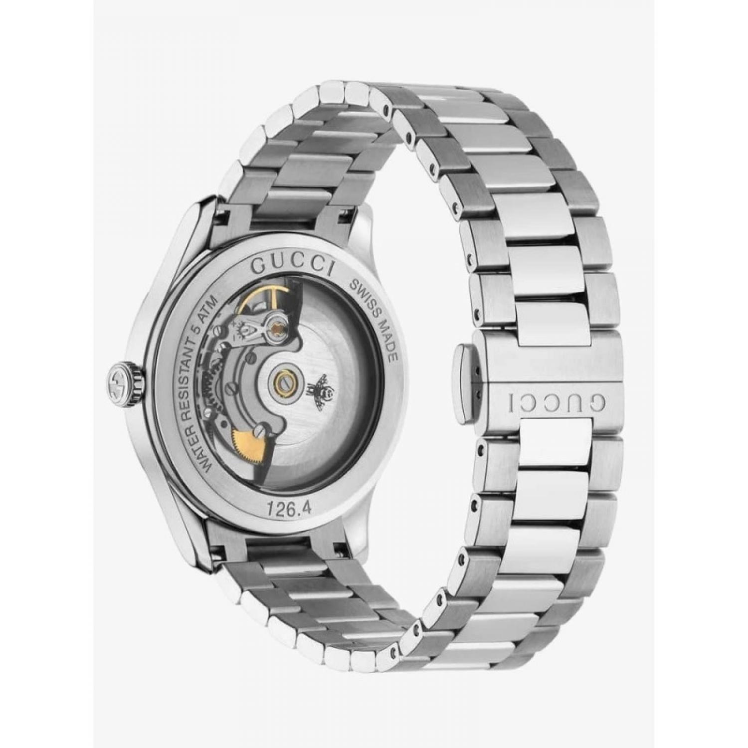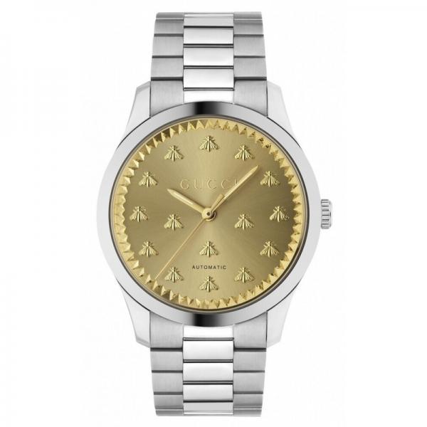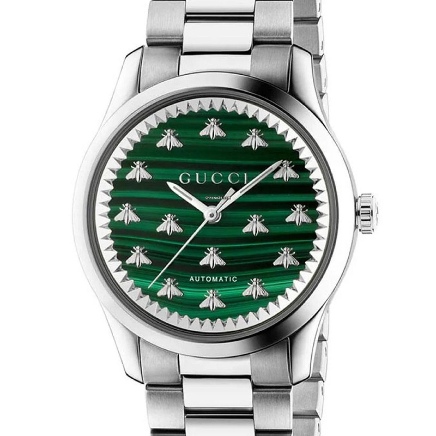Part of the G-Timeless collection, this automatic watch is designed with a green malachite dial, enriched with silver-toned indexes that take the form of the Gucci bee—a distinctive code of the House.