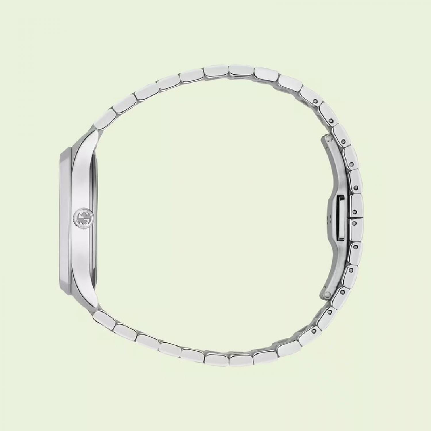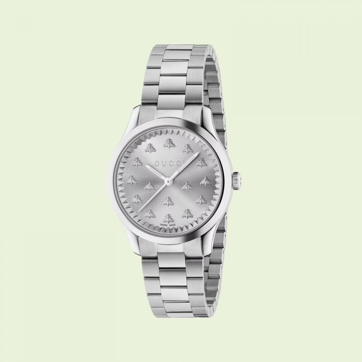 The Gucci bee, a historical symbol from the '70s archives, is combined with a sun brushed dial and steel bracelet. The G-Timeless collection combines classic design details with a contemporary aesthetic to create elevated watches with a timeless feel.