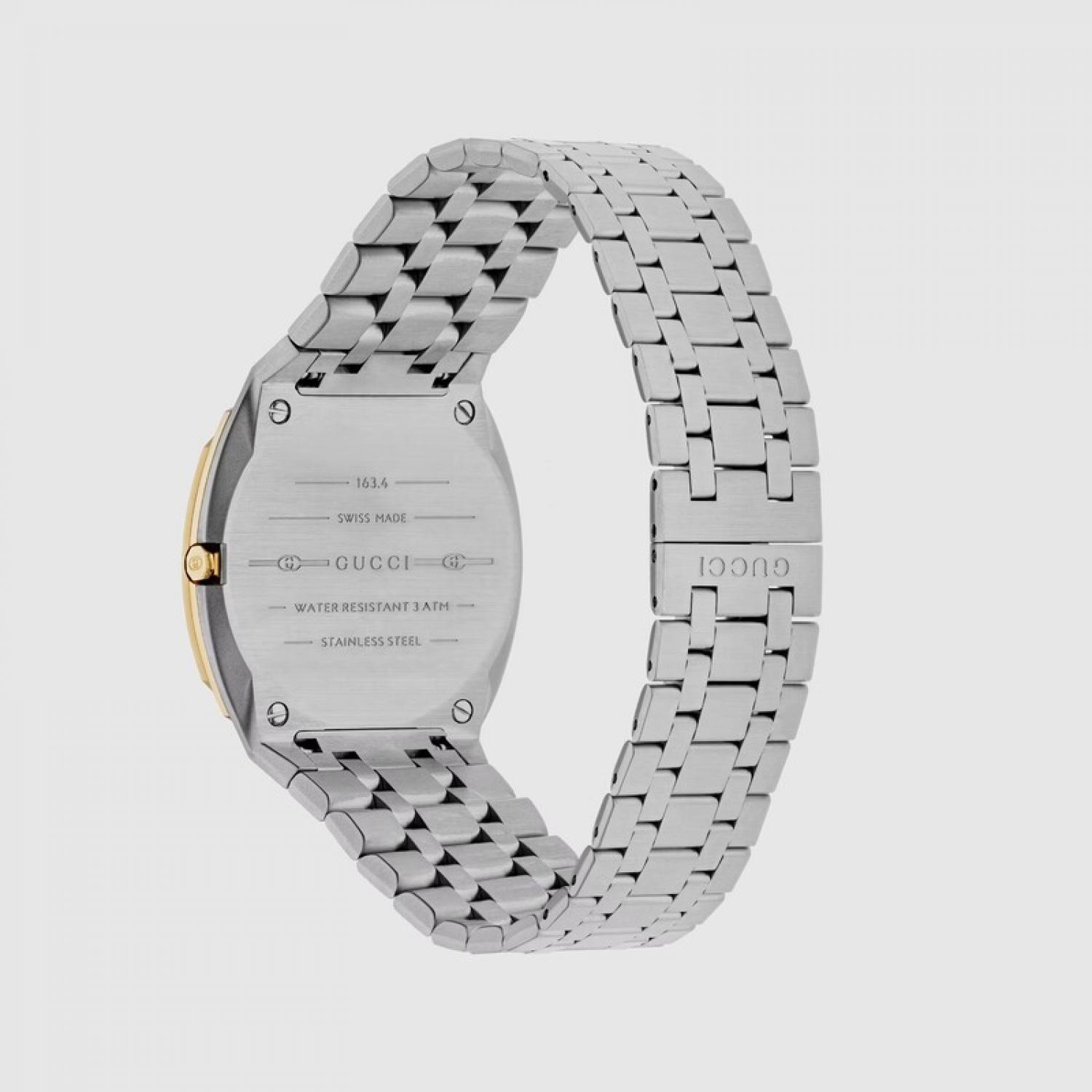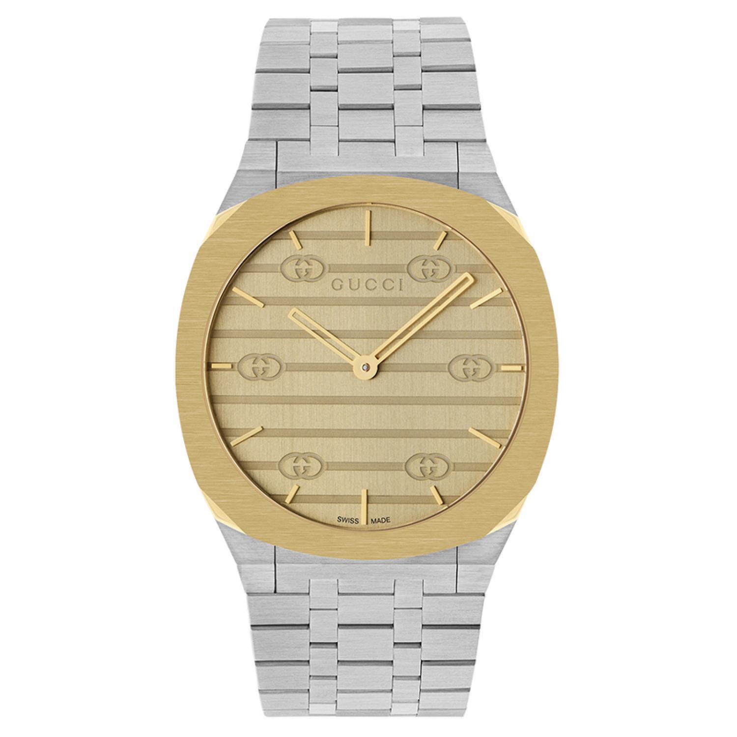 The GUCCI 25H's streamlined silhouette was inspired by the sleek forms of contemporary architecture. The watch is presented with a gold-plated multi-layered case and five-link steel bracelet. The golden brass dial is completed with the Interlocking G motif. The name, GUCCI 25H, is attributed to a particularly symbolic talisman for Creative Director Alessandro Michele.