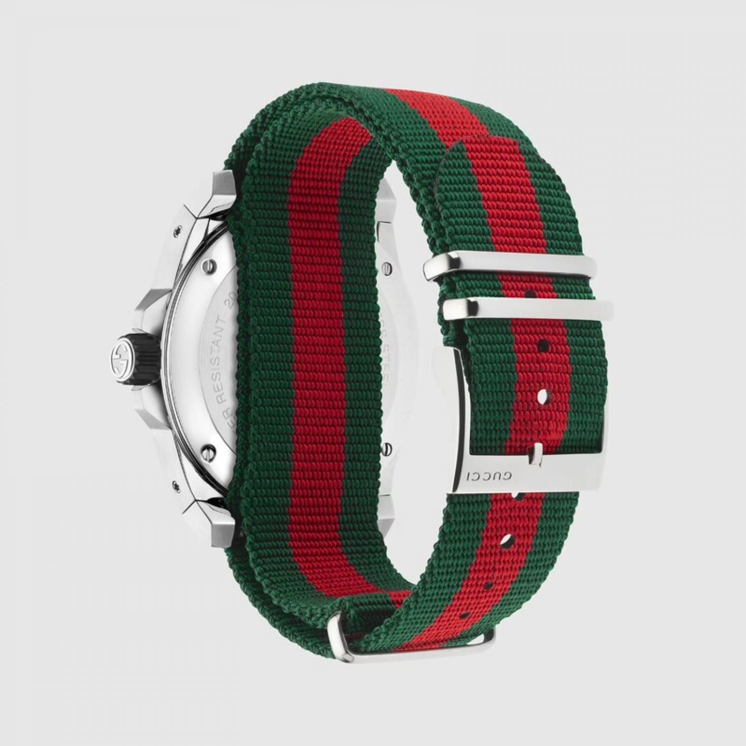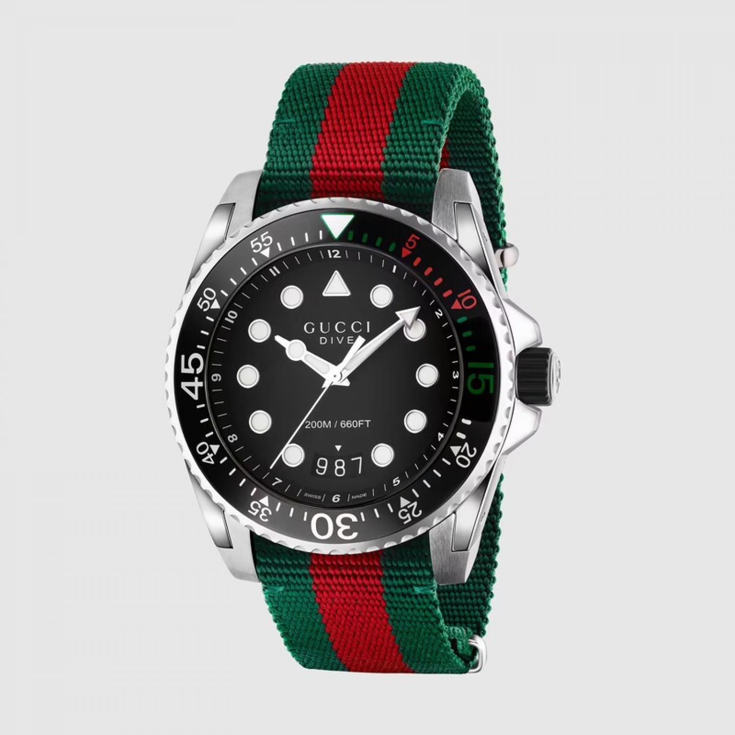 In silhouette that mirrors the recognizable details of a diver's watch, the Gucci Dive has a contemporary appeal with a black matte dial and nylon Web strap.