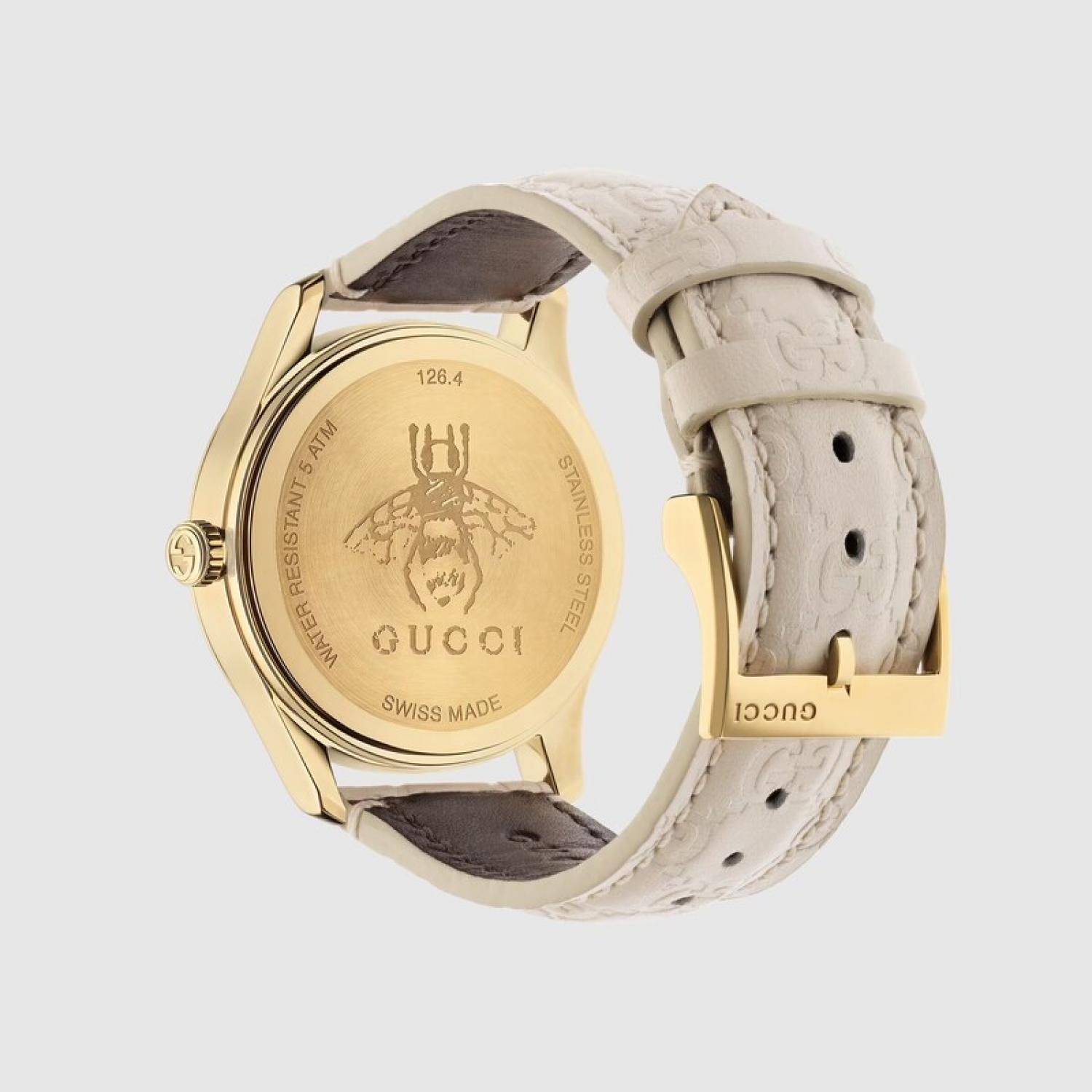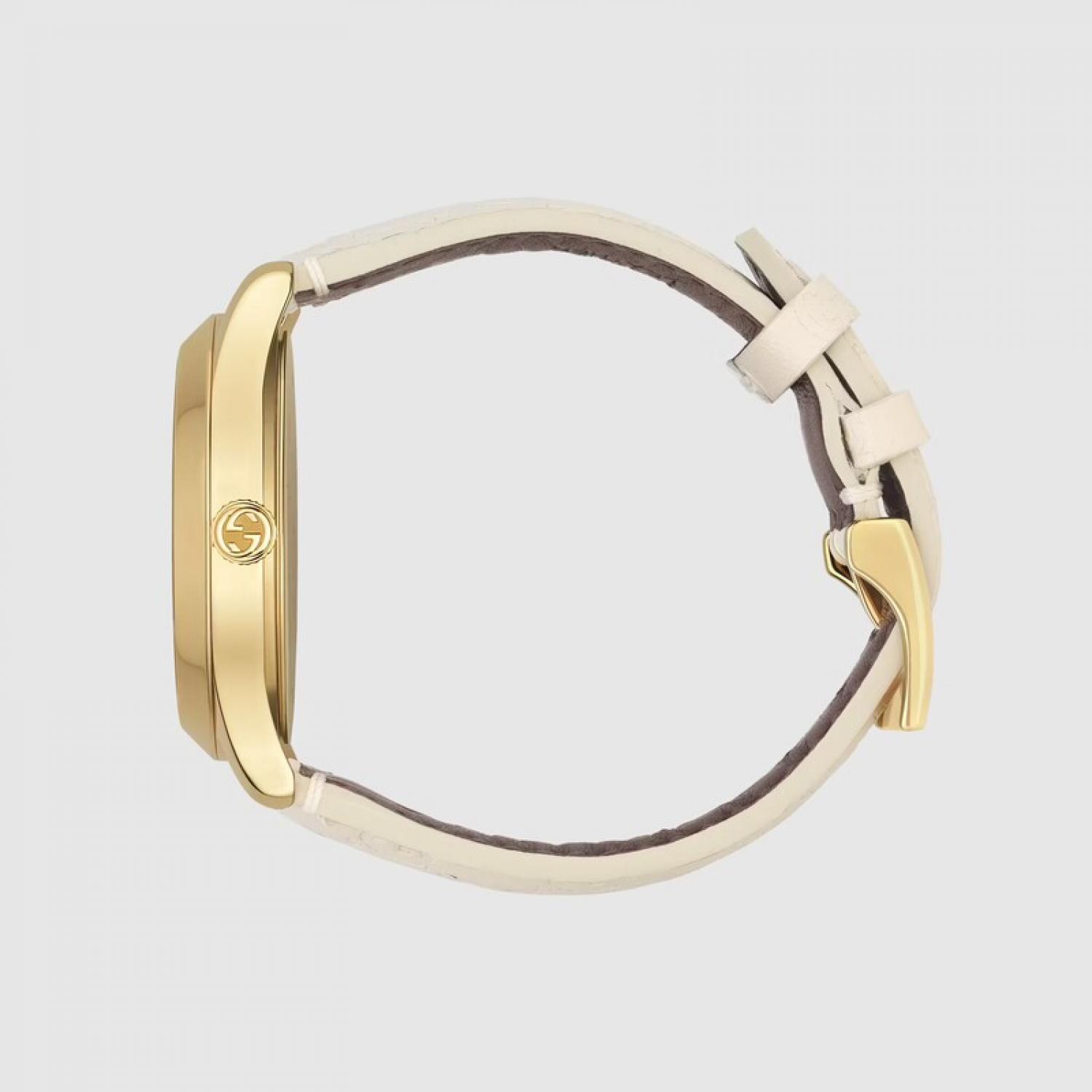 - Yellow gold PVD case, white Gucci Signature leather dial and strap