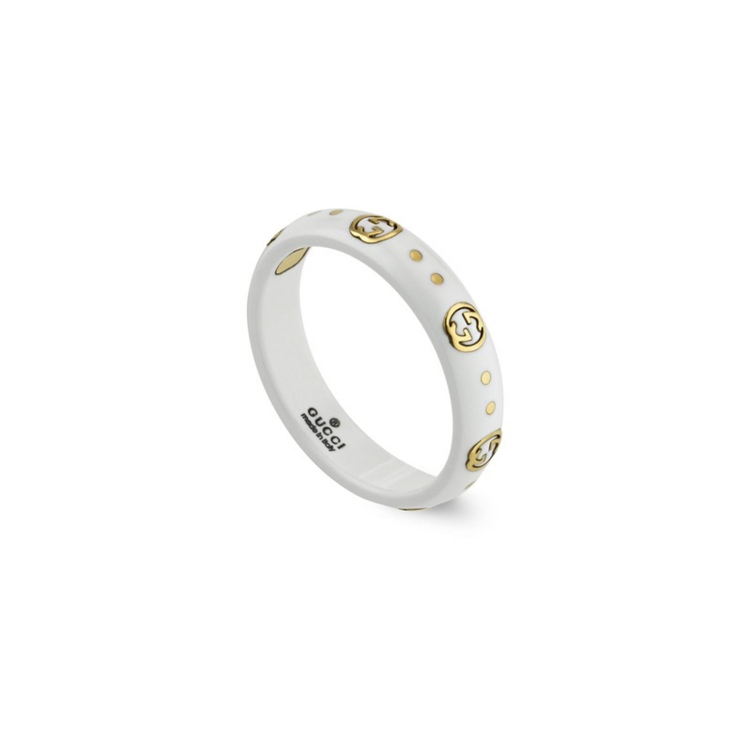 The Icon collection reprises one of the House's most emblematic motifs. The Interlocking G, representative of Founder Guccio Gucci's initials, is presented in yellow gold, contrasting against a white synthetic zirconia band.