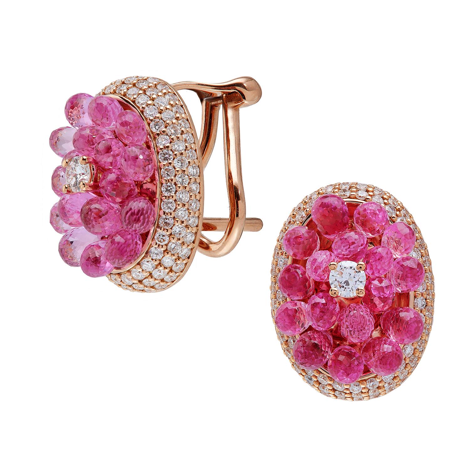 18K Rose gold earrings with 6,79ct pink briolette sapphires and in the centre, a 0,08ct G-VVS brilliant cut diamond with 0,94ct G-VVS brilliant cut diamonds surrounding it.