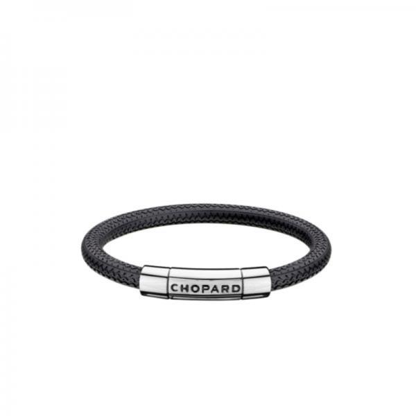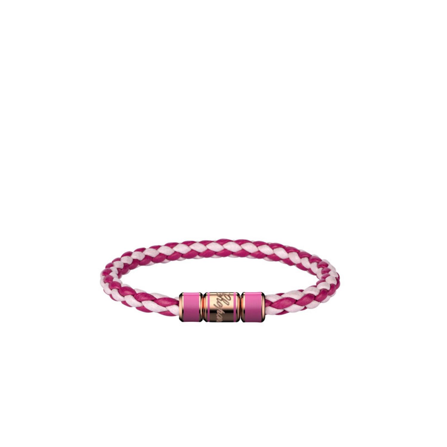 The Signature bracelet in two-tone fuchsia and pale pink woven calf leather is as captivating as it elegant. Finely engraved with the Chopard logo, pink gilded and patent bright pink metal clasp adds a touch of sophistication to this discreetly luxurious gem. Symbol of attachment, friendship or love, this is an essential piece to enhance a look that is both chic and casual.
