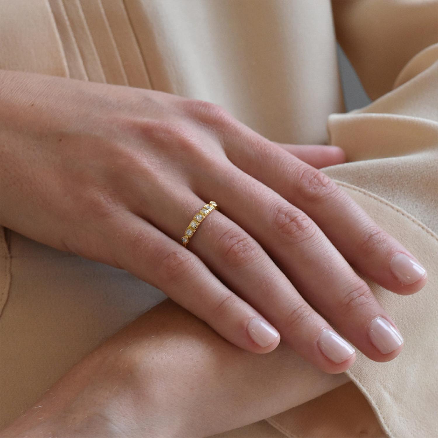 Thin diamond band ring in 18k yellow gold.