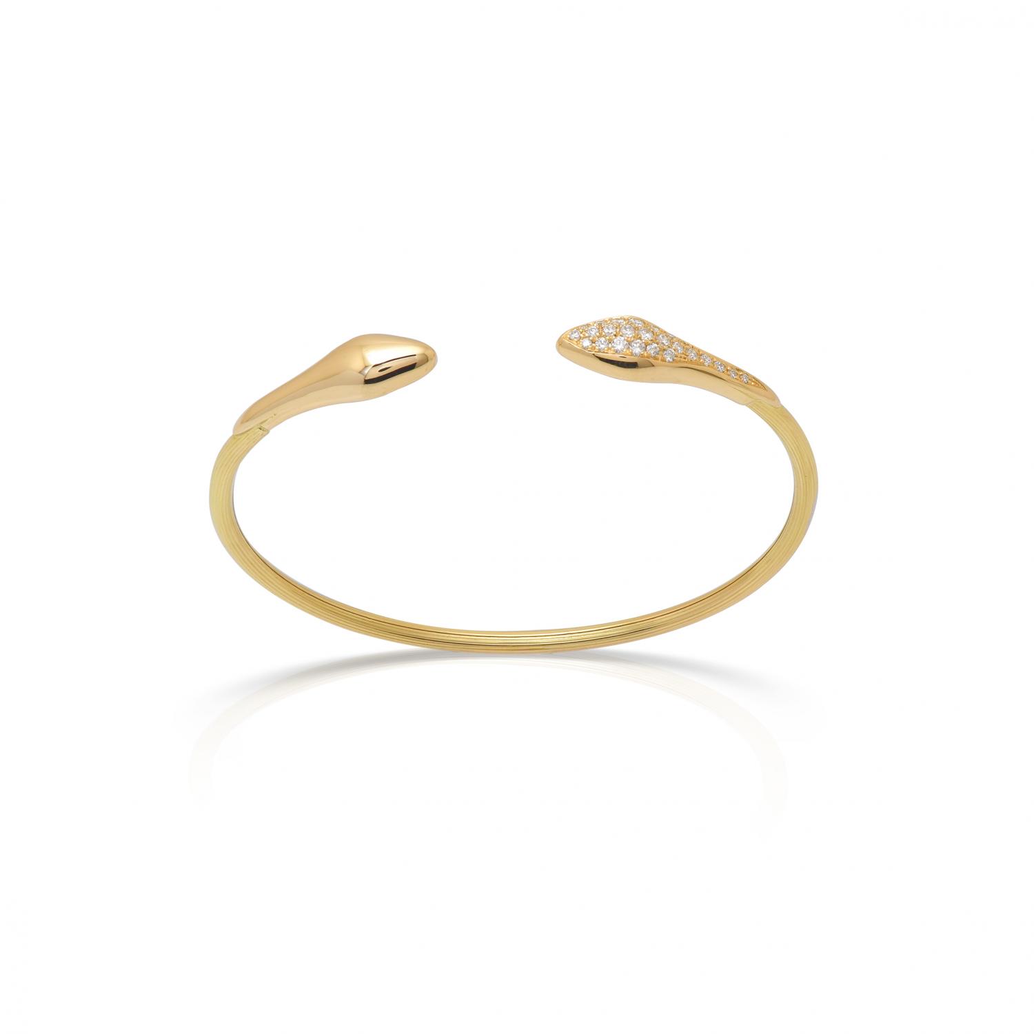 Snake wire bracelet in 18k fluted yellow gold with one snake head polished and one with pave diamonds
