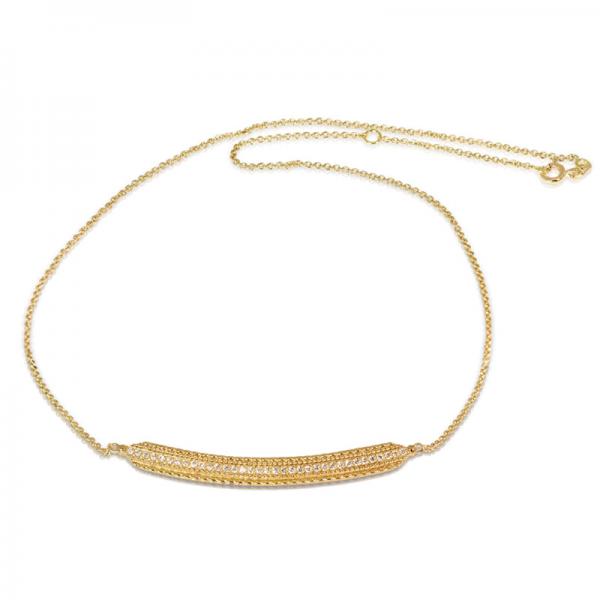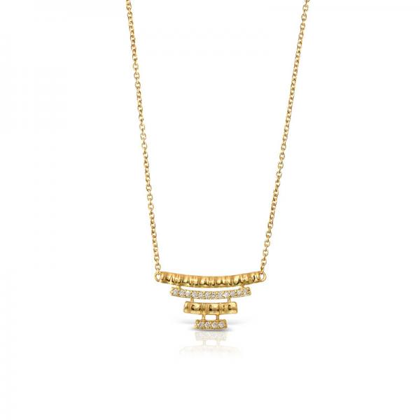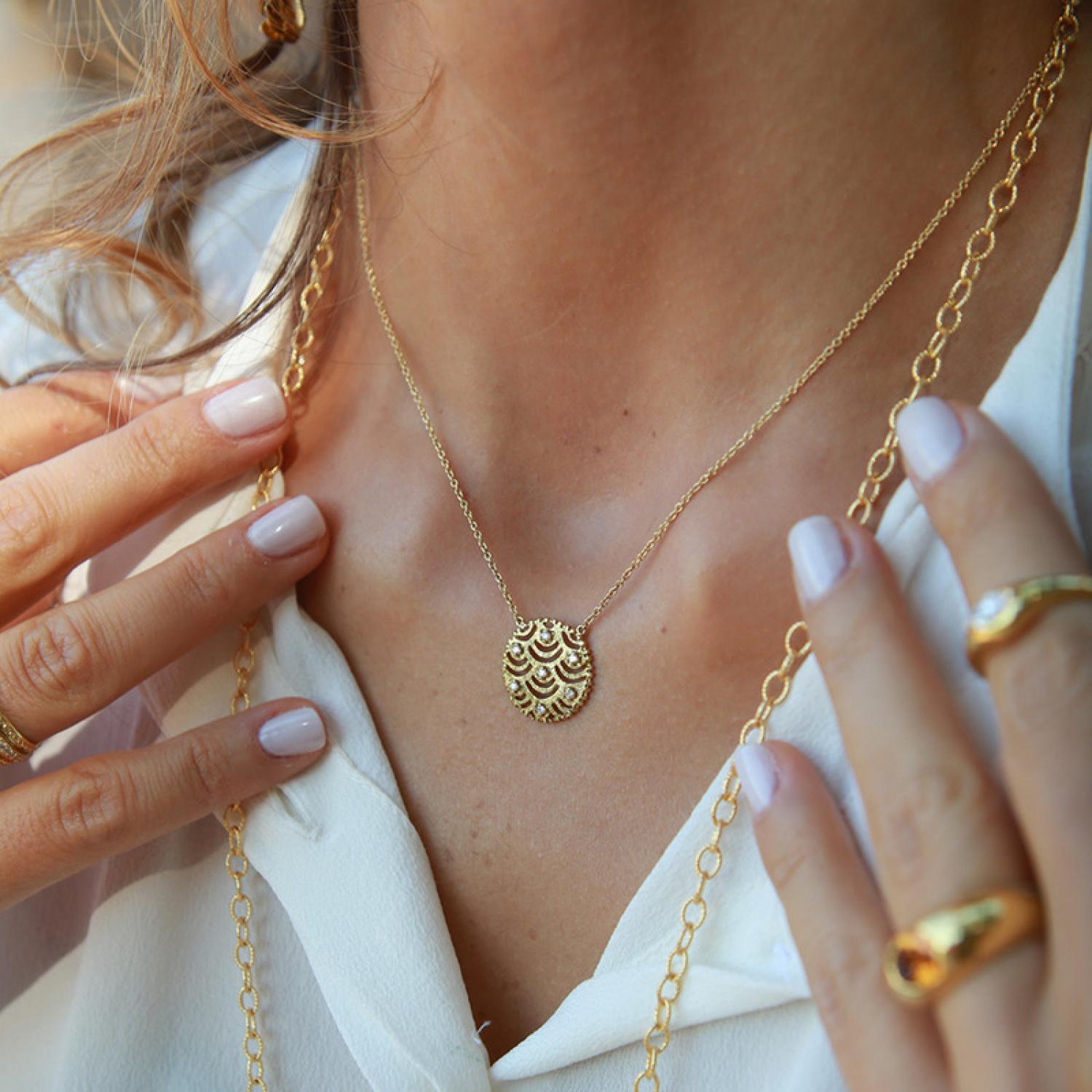 Necklace with round scalloped motif in 18k textured gold and diamonds with a 42cm chain.