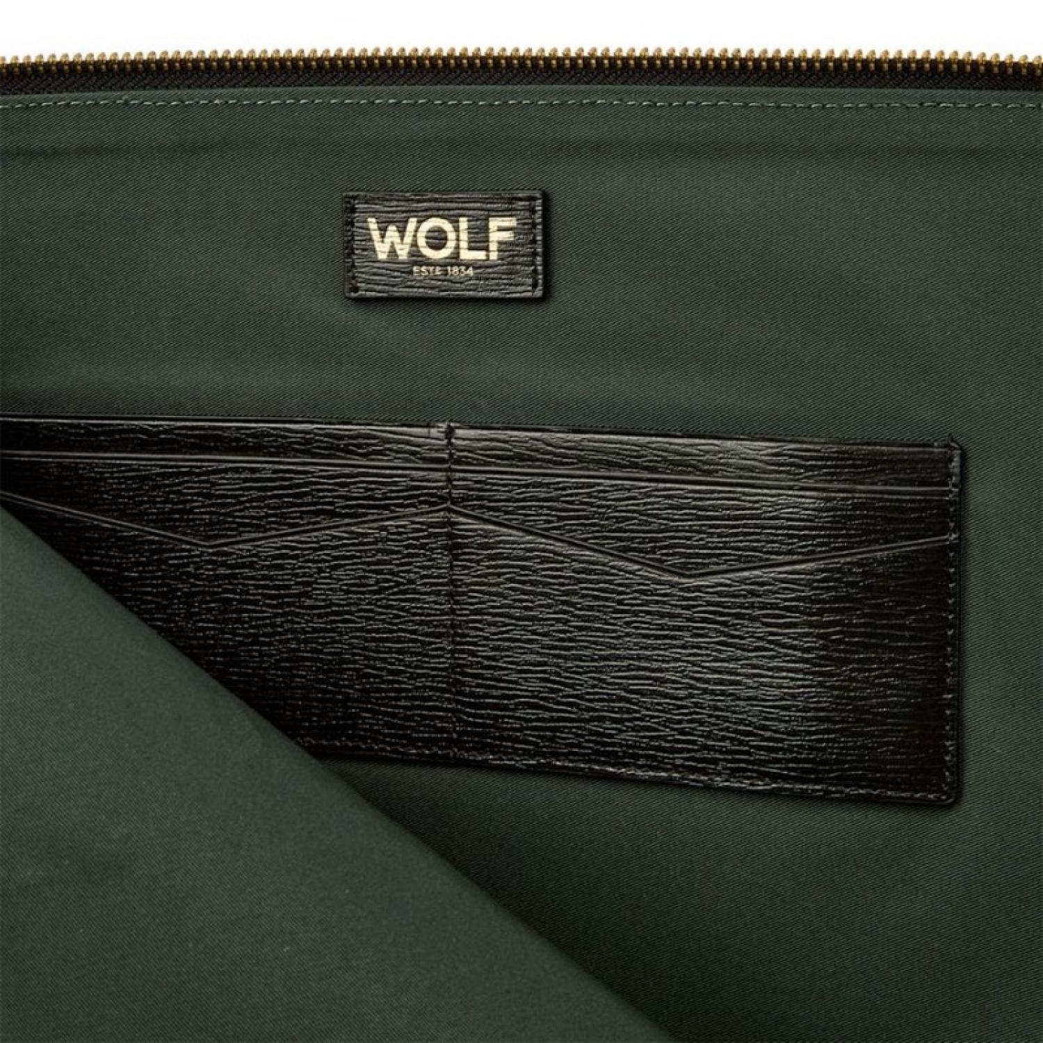The ‘W’ collection; sleek, black, embossed grain leather, with touches of gold across leather wallets, business accessories and a dopp kit. Pure sophistication comes from classic design with WOLF’s trademark attention to detail. Carry your laptop in style with the W Logo laptop sleeve, containing 4 credit card slots, an exterior zip with a WOLF branded puller, and RFID protection to keep your personal data safe. The exterior is made from sustainably sourced embossed cow leather, with lining made from recycled plastic bottles.