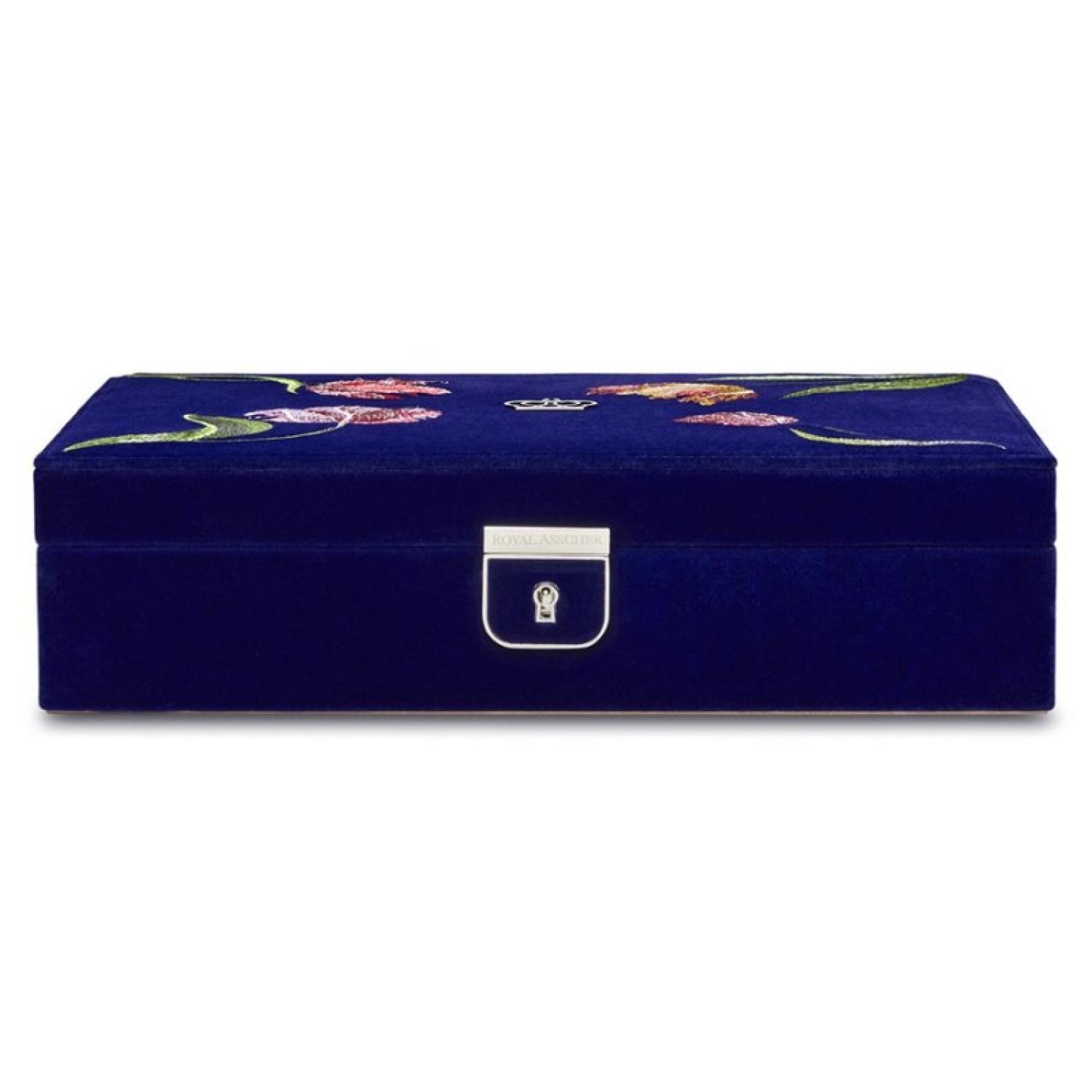 The Medium Jewellery Box features deep blue velvet exterior with elaborate tulip embroidery inside and out, the medium jewellery box with removable travel case, displays and organises your jewellery in style. Includes LusterLoc™ anti-tarnish lining and lock & key with silver finish.