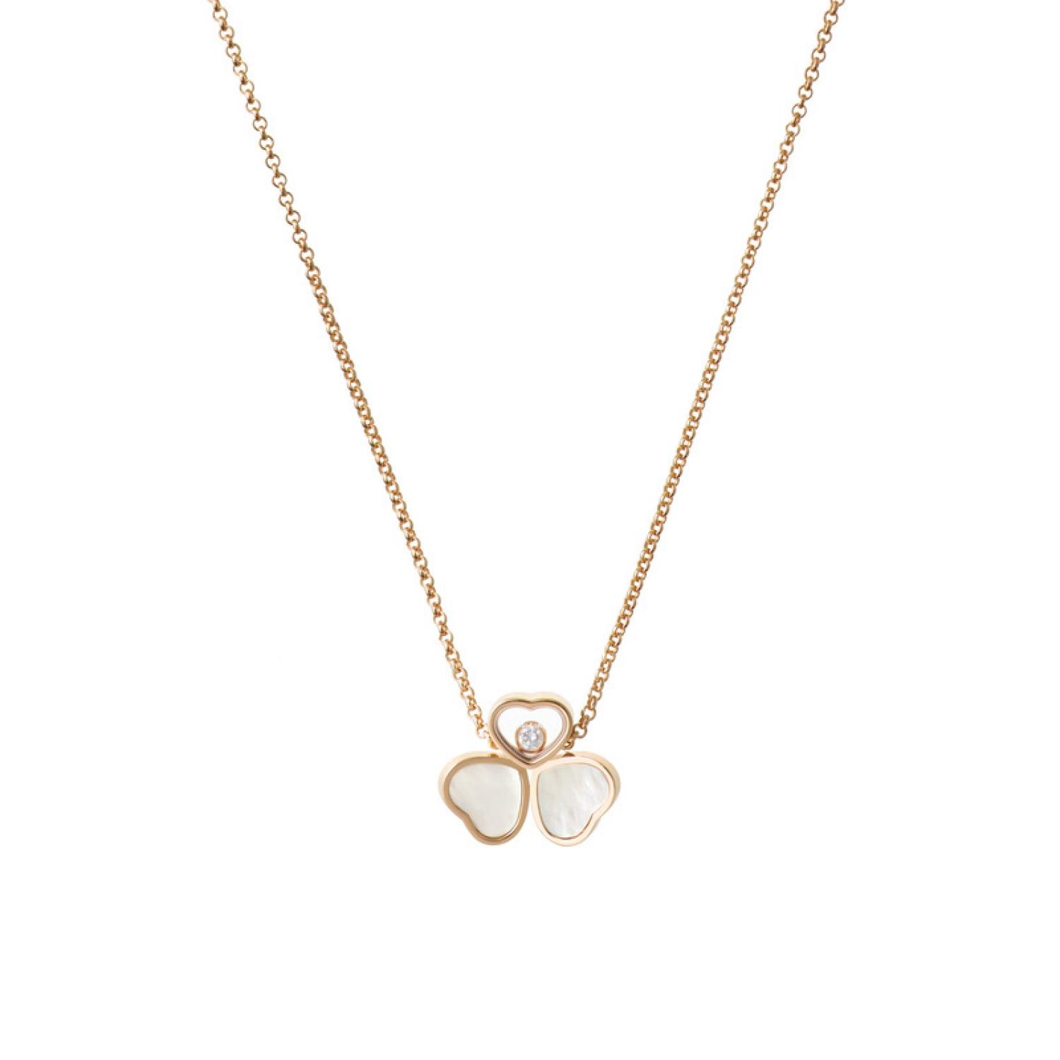 The butterfly, the ultimate emblem of lightness, has infused all its delicacy and symbolic strength into Happy Hearts Wings diamond necklaces. It finds exquisitely refined expression in the design of this luxury jewelry collection, echoing the symbols of the Maison Chopard. Two mother-of-pearl and rose gold hearts, arranged like butterfly wings, are suspended from a heart with a dancing diamond nestling inside. Little Diamonds Do Great Things