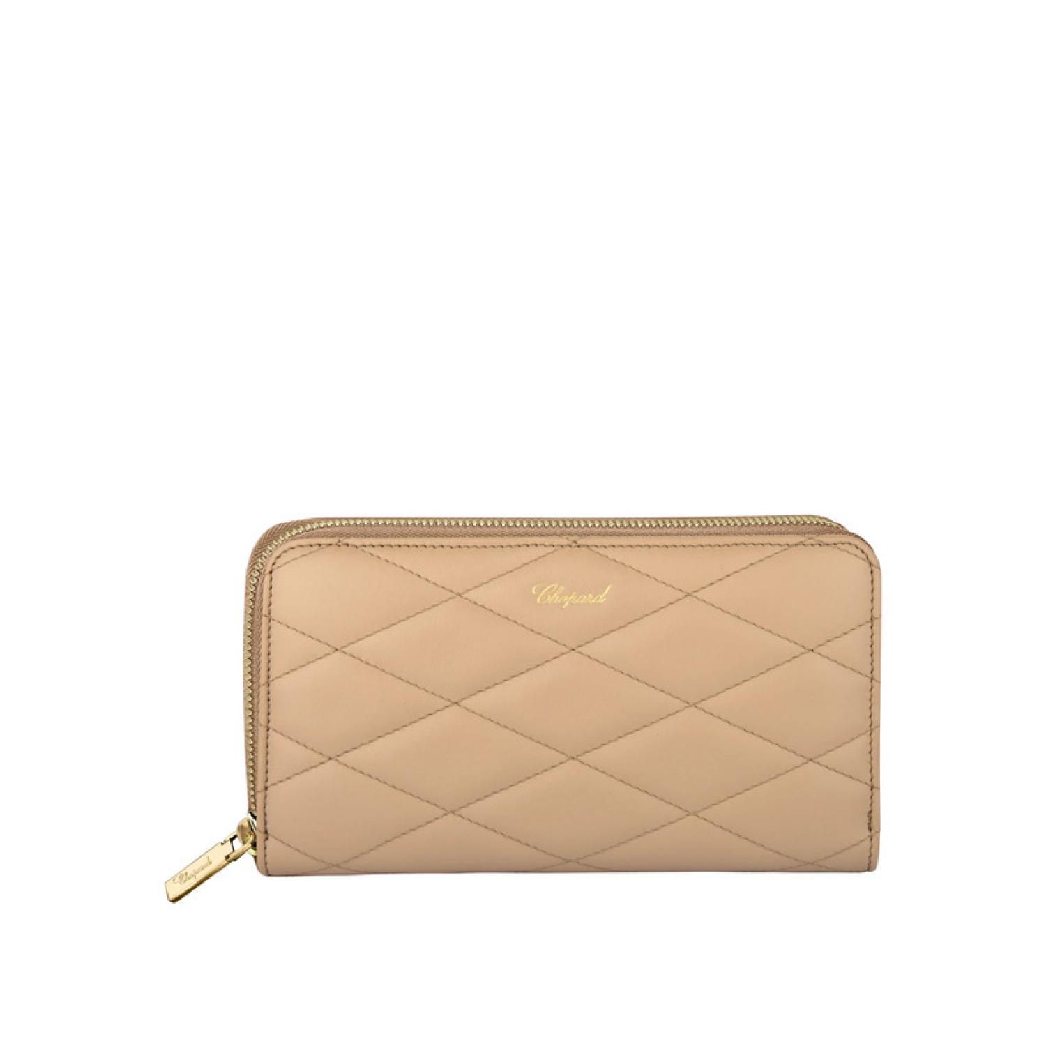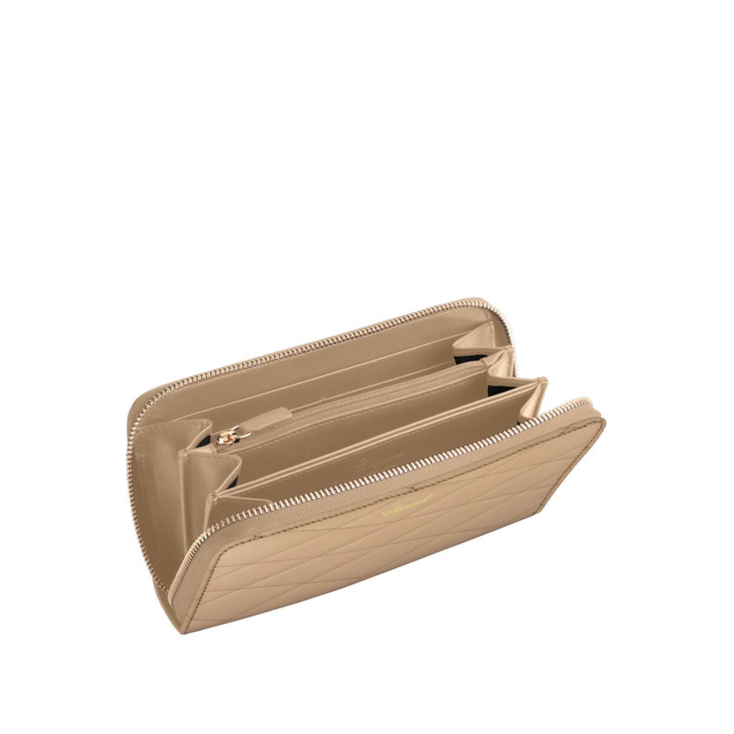Elegant and ultra-functional thanks to its multiple compartments, this Classic leather wallet is encircled by a long zipper with aged-gilt metal finish. The camel-colored quilted calfskin, adorned with the gold embossed Chopard logo, testifies to Chopard's meticulous expertise in the choice of materials.