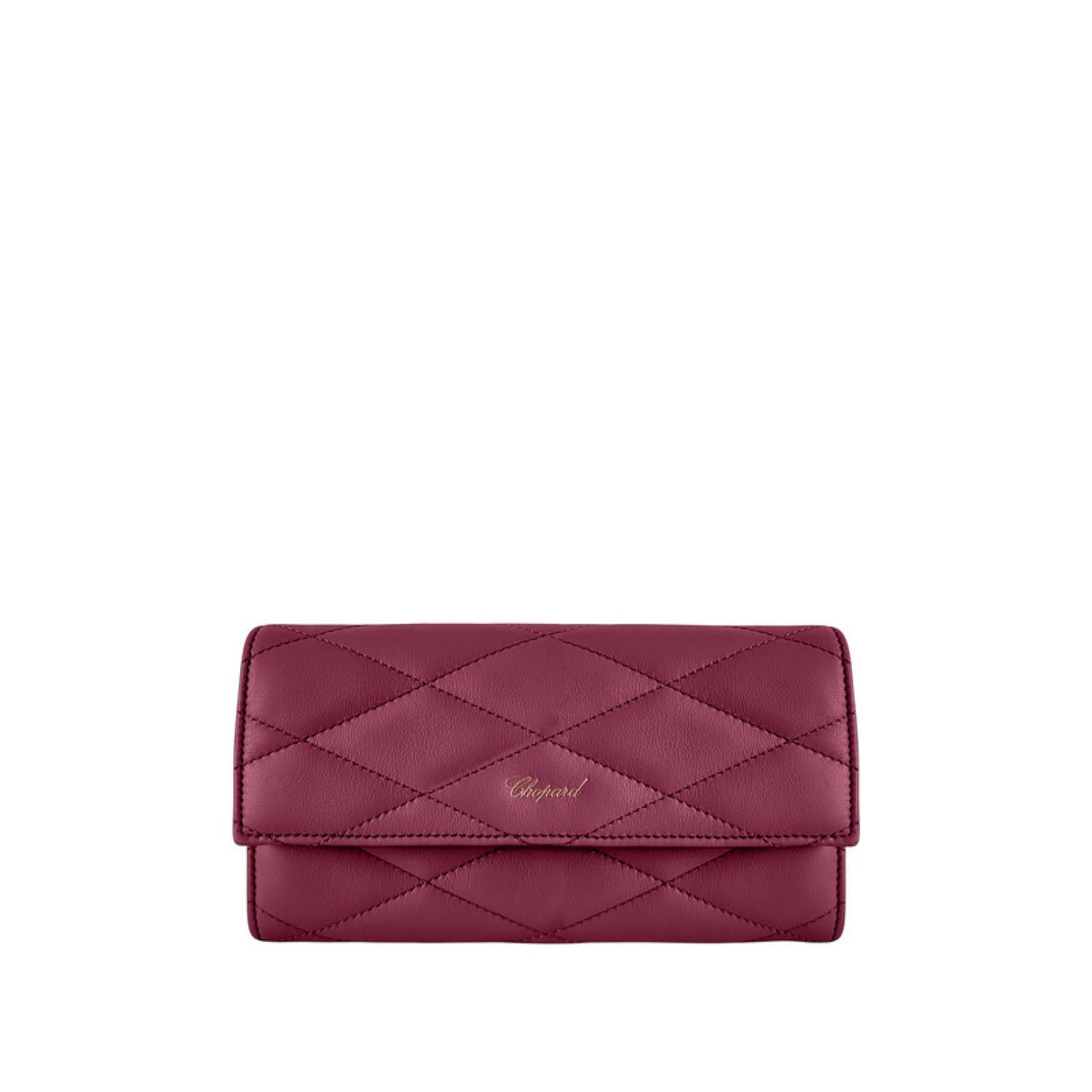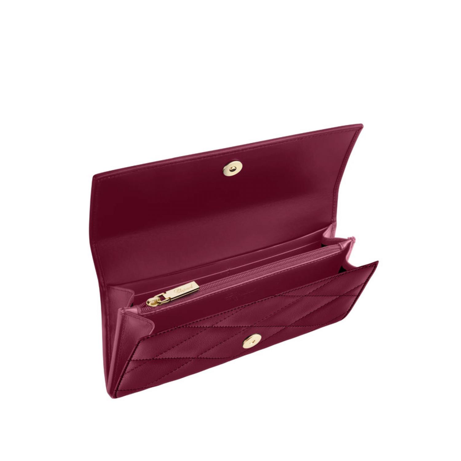 The continental leather wallet is distinguished by its impeccable lines, enhanced by delicate finishes in aged-gilt metal. It features multiple compartments for everyday essentials. Crafted in burgundy quilted calfskin, this luxury wallet reveals unparalleled elegance, beautifully embossed with the Chopard logo.