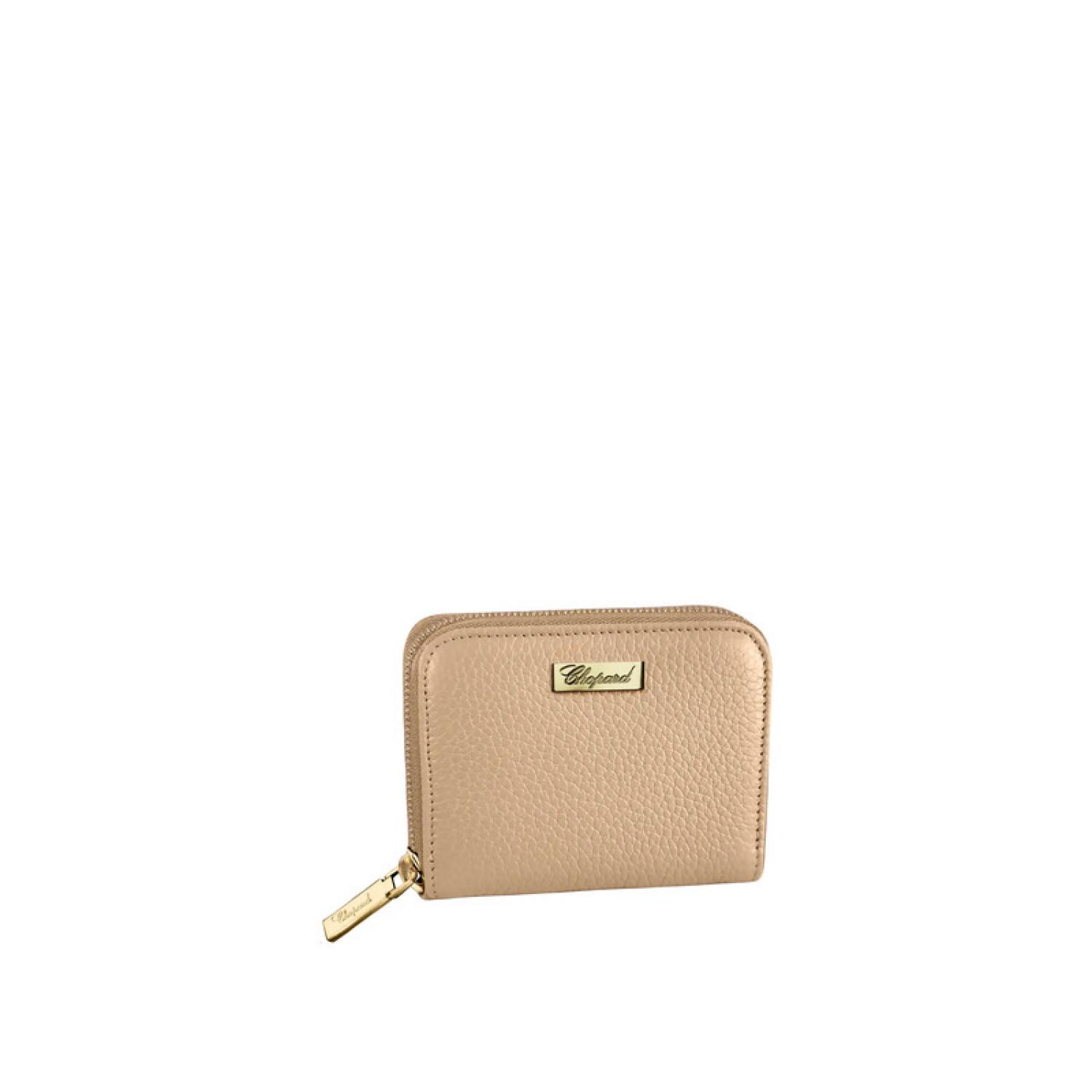 Nestled in the palm of your hand or tucked away in your bag, this mini leather wallet exudes immense style. The sophistication of the aged-gilt metal, embossed with the Chopard logo, contrasts beautifully with the nobility of the camel-colored grained calf leather. Compact, chic and practical.