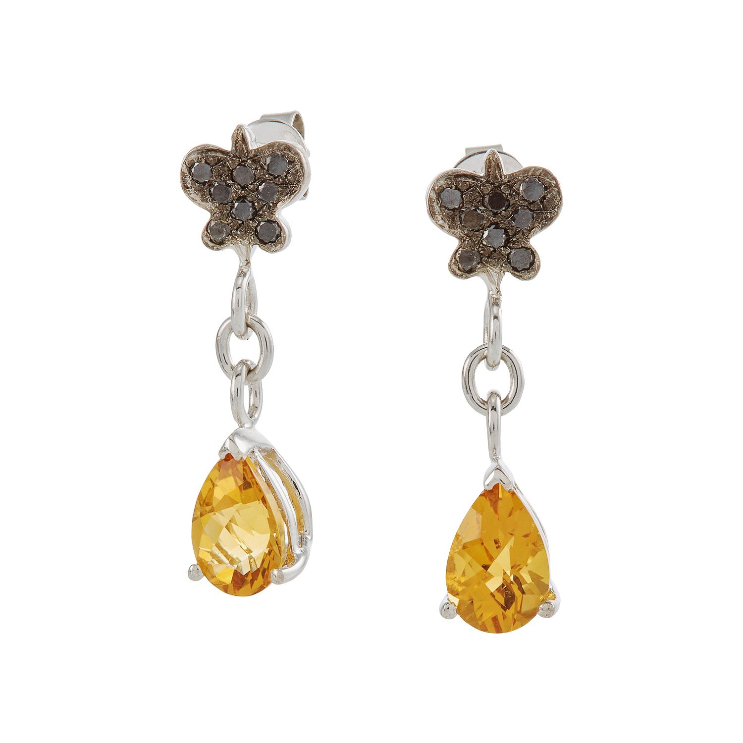 Dangling earrings with black diamonds on black rodination and pear shaped citrine peach stone.