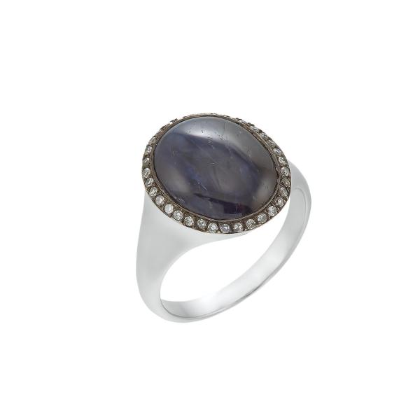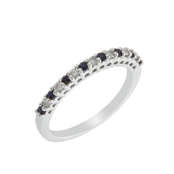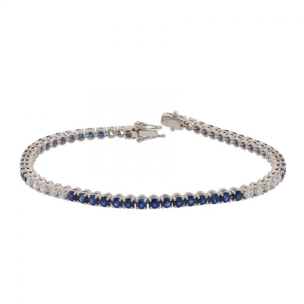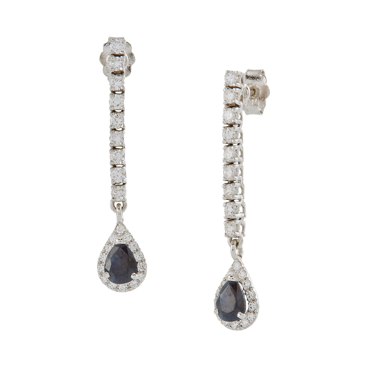 Dangling tennis earrings with diamonds and deep indigo colored sapphires.