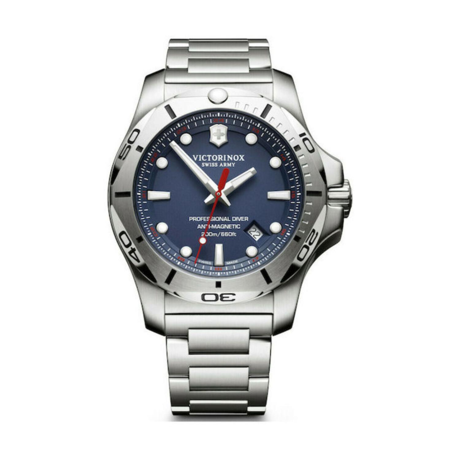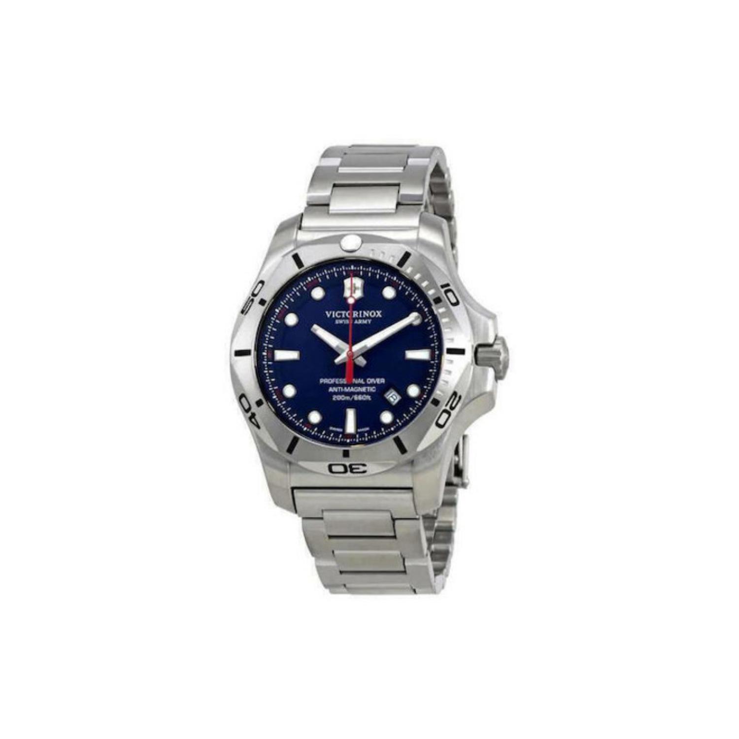 Men's analog watch by Victorinox, large size with metal bracelet in silver color. It features a battery mechanism, which is based on the electrical energy provided by the battery, resulting in accuracy and durability. It is suitable for free diving with equipment.